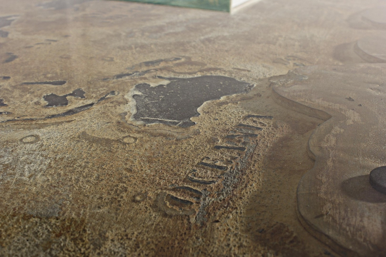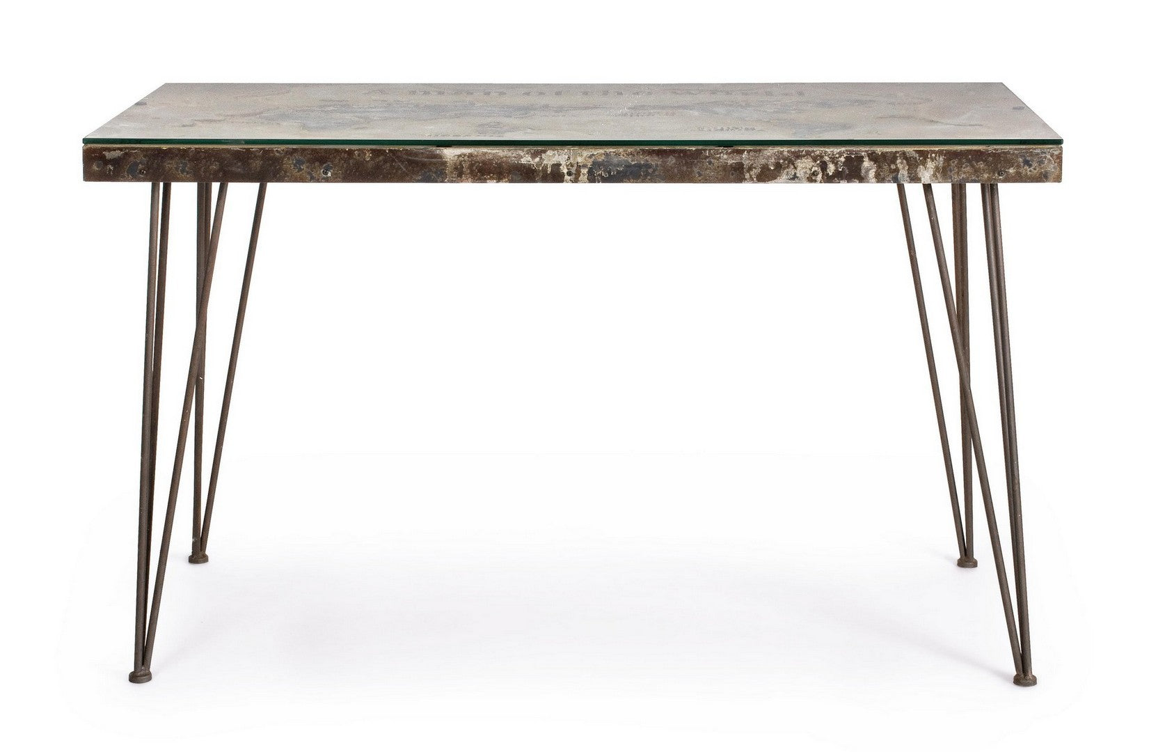 Struttura in acciaio anticato, piano in vetro e mdf con decorazione in cemento.