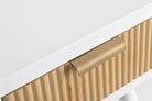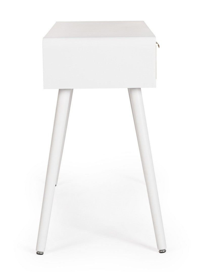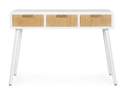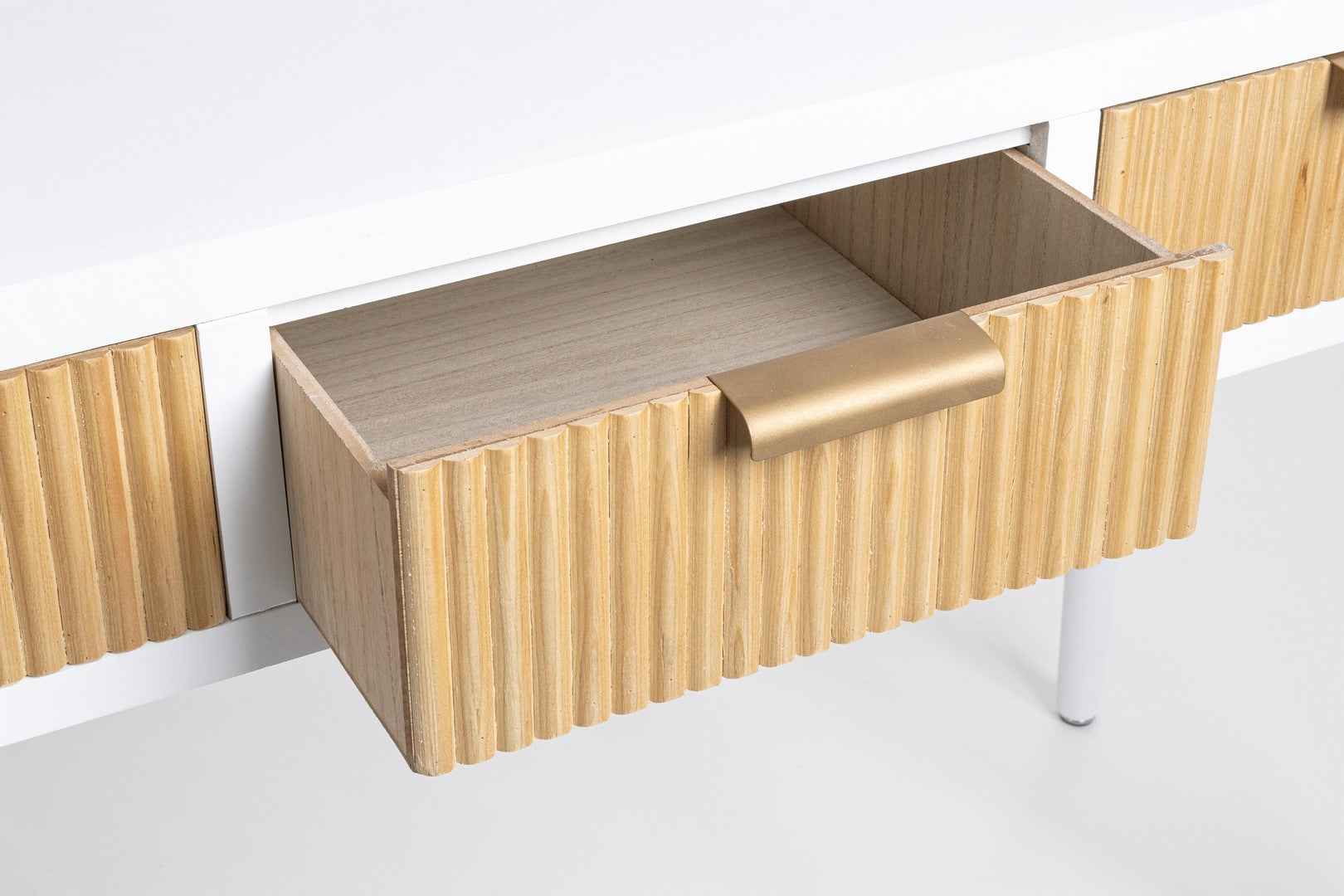 La struttura in MDF garantisce una superficie liscia e uniforme, mentre la combinazione di bianco e naturale aggiunge un tocco di freschezza e calore all'ambiente. La consolle è progettata per adattarsi a diverse aree della casa, come l'ingresso, il corridoio o la sala.