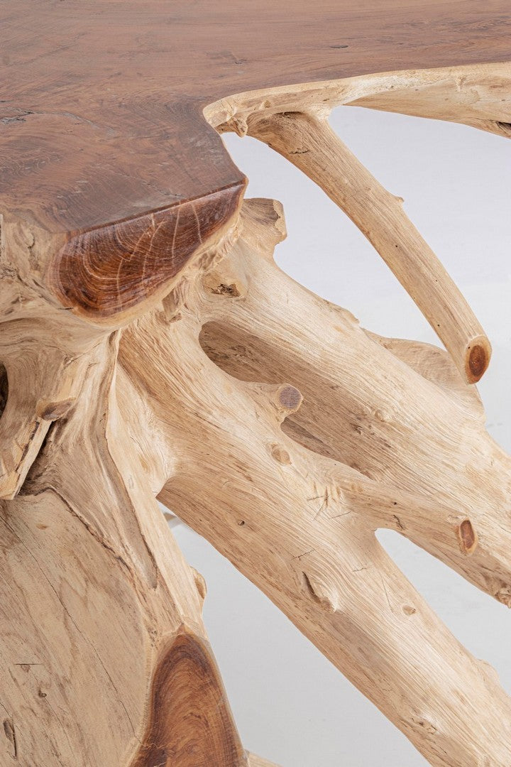 Ogni radice di teak ha forme e linee irregolari, che danno vita a una base scultorea, dal design irreplicabile.