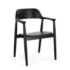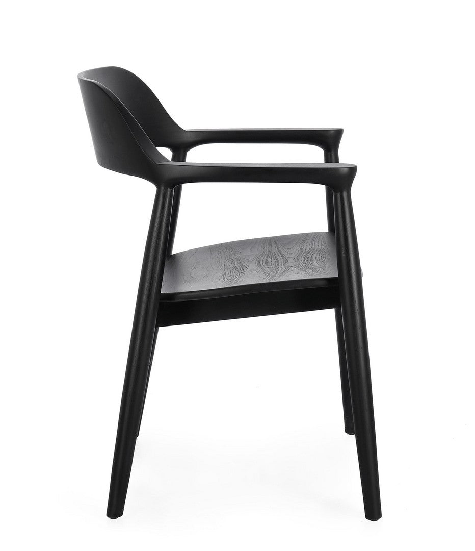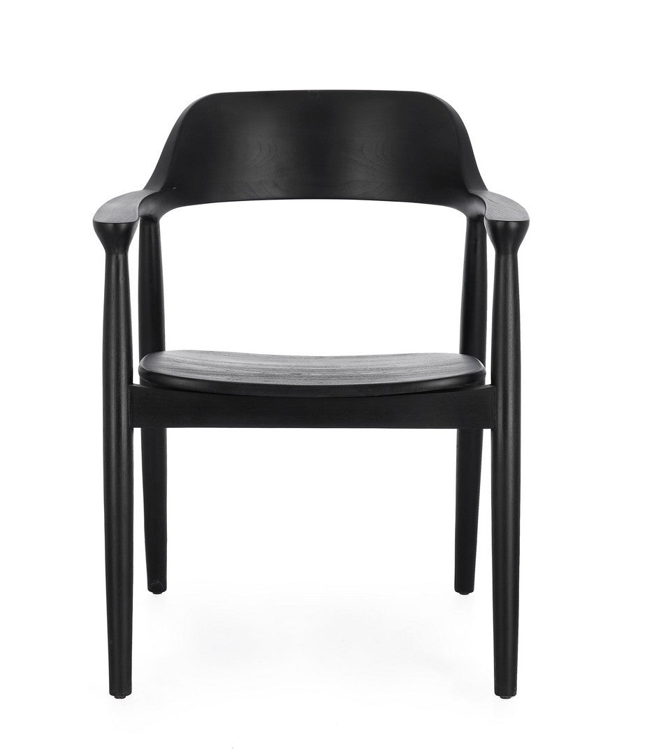 La sedia "Idris" è un raffinato elemento d'arredo per interni, realizzata in legno di teak con braccioli, interamente rifinita in un elegante colore nero.