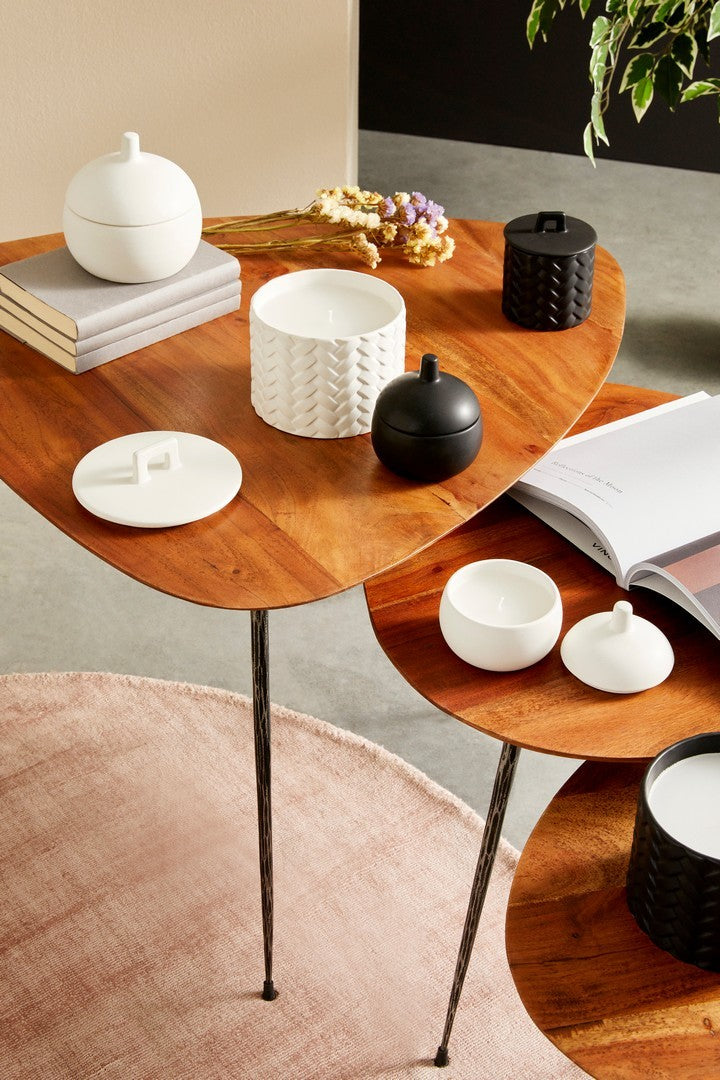 I piani sono realizzati in legno di mango, materiale pregiato noto per le sue venature ricche e la calda tonalità dorata, che conferiscono ai tavolini una presenza accogliente e un carattere unico.