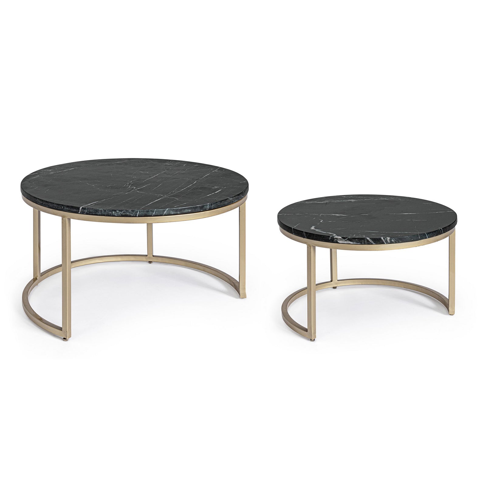 Il piano dei tavolini è realizzato in marmo, un materiale pregiato che arricchisce ulteriormente il design con un tocco di lusso.