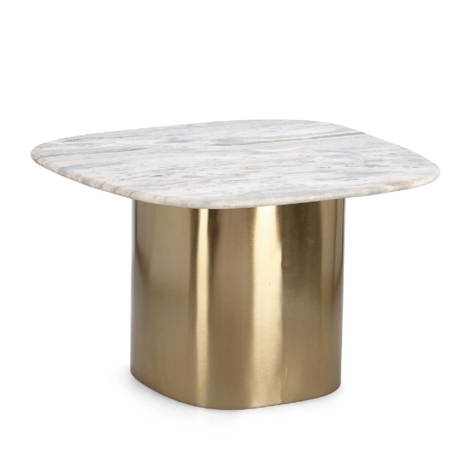 Il piano in marmo, con una delicata finitura naturale, conferisce al tavolino un'eleganza senza tempo, mentre la base in acciaio verniciata oro aggiunge un tocco di lusso e glamour.