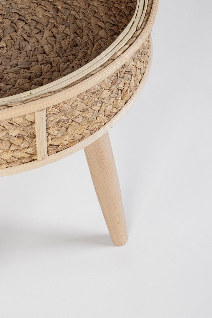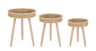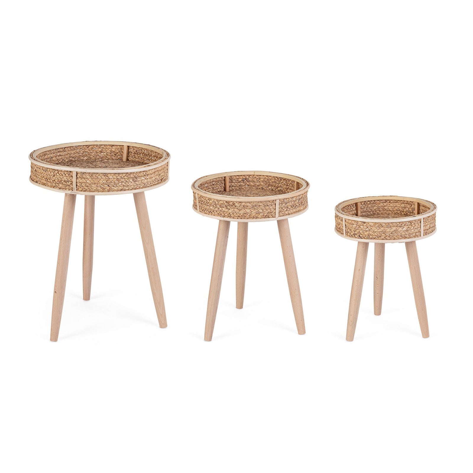 Composto da un set di tre tavolini, ciascuno con struttura in materiale vegetale intrecciato e dettagli in rattan di alta qualità, il design evoca un fascino rustico e contemporaneo allo stesso tempo.