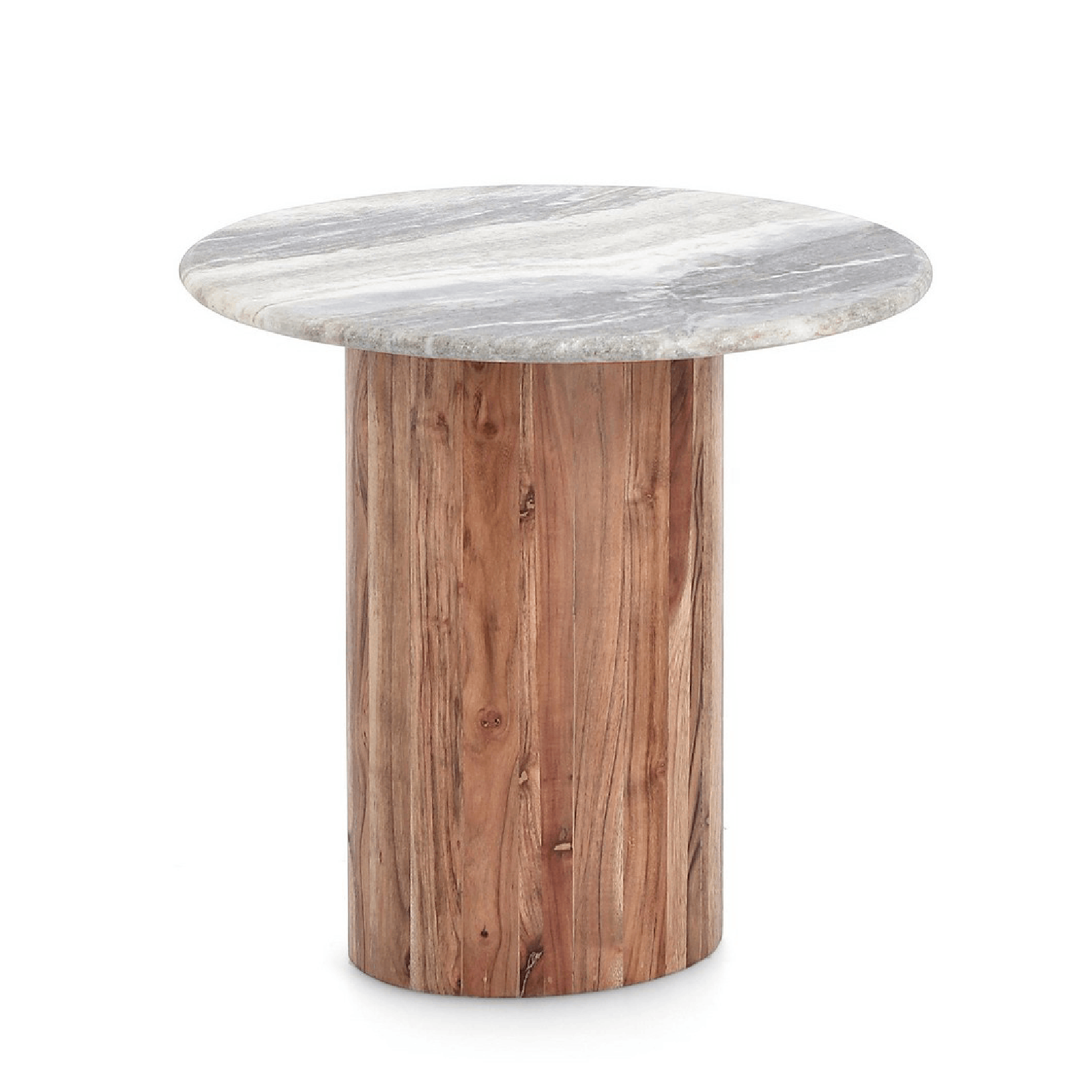 Il tavolino Eloy con un diametro di 45 cm è un'elegante aggiunta a qualsiasi spazio abitativo, combinando la bellezza intrinseca del marmo con la calda naturalezza del legno di acacia.