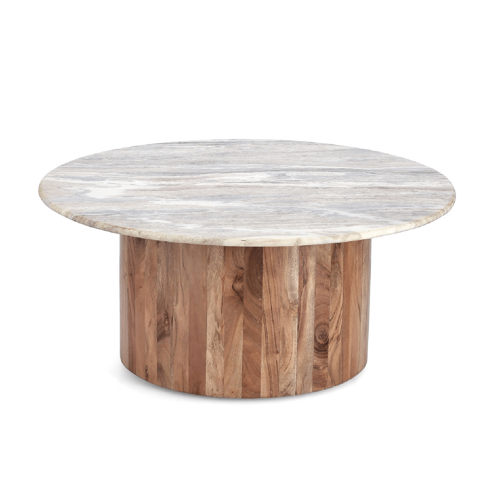 Con un piano in marmo dalla finitura naturale che evidenzia la bellezza intrinseca della pietra e una base in legno di acacia anch'essa dalla finitura naturale, questo tavolino offre un equilibrio armonioso tra materiali e design.