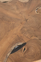 Il teak, noto per la sua durevolezza e le sue splendide venature, viene trasformato in un elemento decorativo dal forte impatto visivo: le radici, mantenute nelle loro forme irregolari e uniche, fanno sì che ogni tavolino "Elwood" sia un pezzo irripetibile, dotato di una texture che richiama le linee della natura.