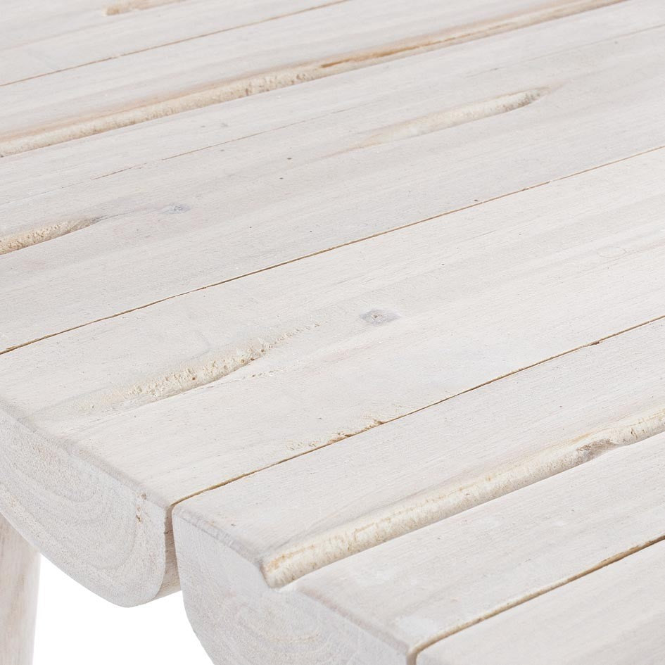 Il teak, noto per la sua resistenza e durabilità, è trattato con una finitura sbiancata, che ne esalta le venature uniche e dona al legno una tonalità chiara, quasi eterea, capace di arricchire l’ambiente con un tocco di freschezza e leggerezza.