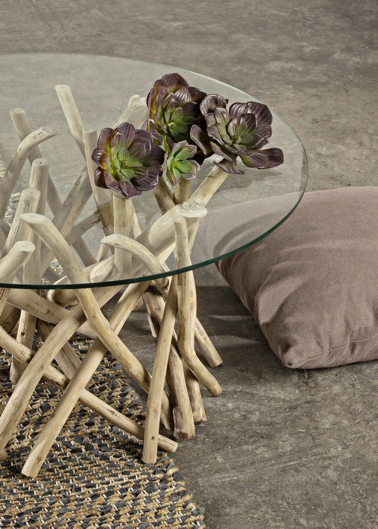 Realizzato interamente con rami di teak, questo tavolino si distingue per la sua struttura organica e unica.