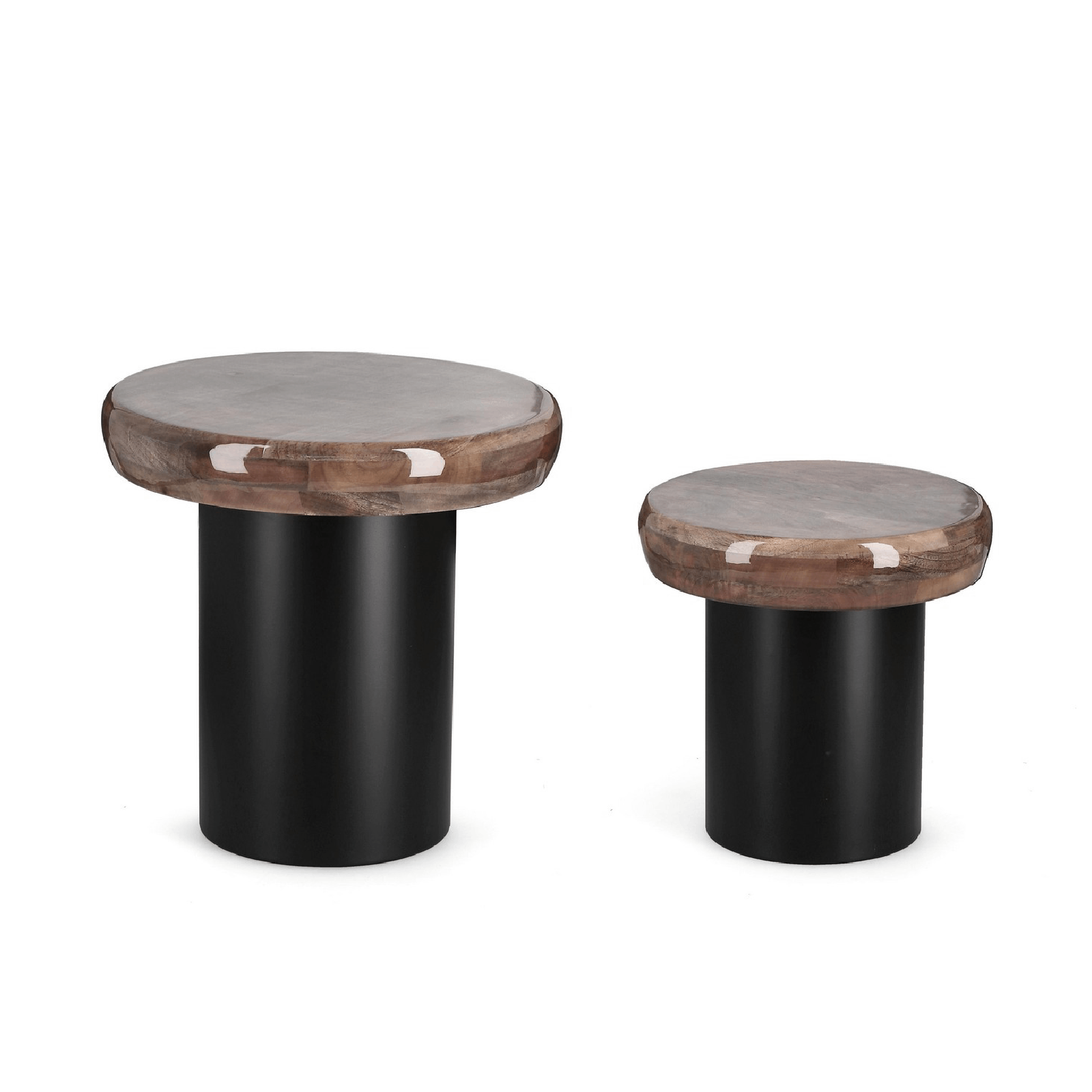 Con un piano in legno di mango dalla finitura smaltata e una base in acciaio verniciata a polvere epossidica, questi tavolini offrono un'armoniosa combinazione di materiali che si adatta a una varietà di stili di arredamento. Le dimensioni dei tavolini sono Ø35a x 34h cm e Ø45a x 44h cm.