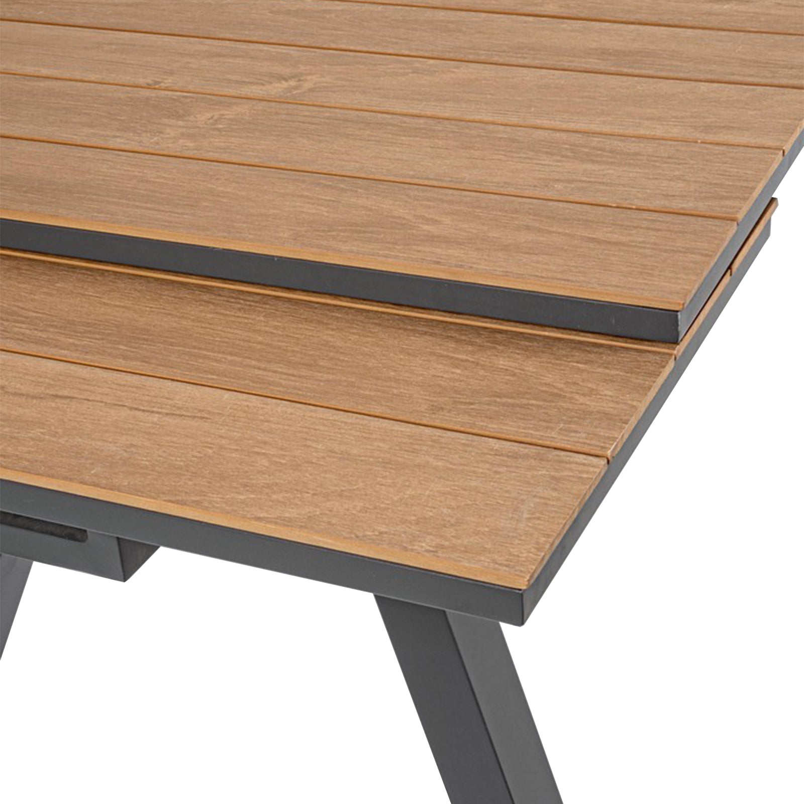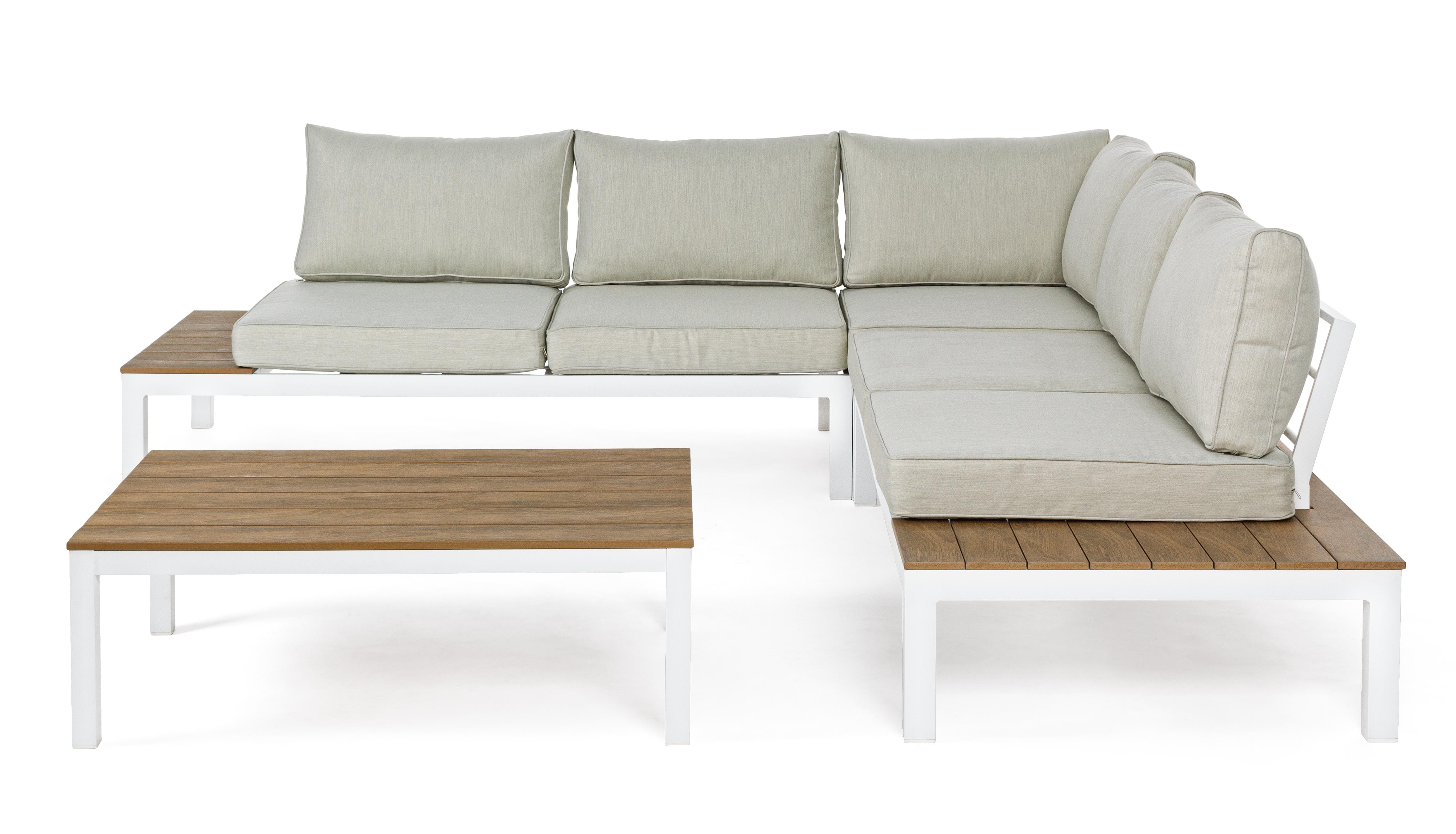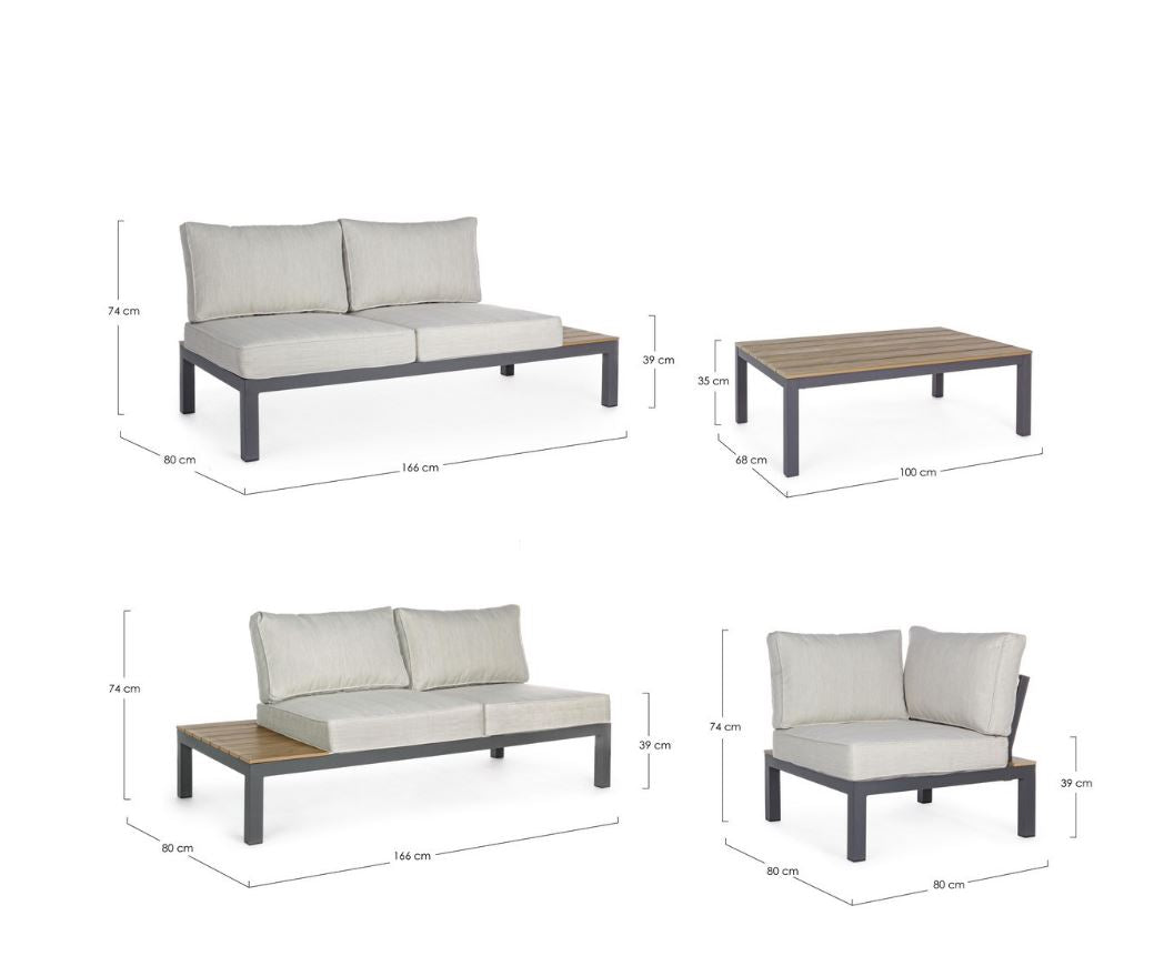 - Materiale braccioli e piano tavolino: In alluminio con verniciatura effetto legno.