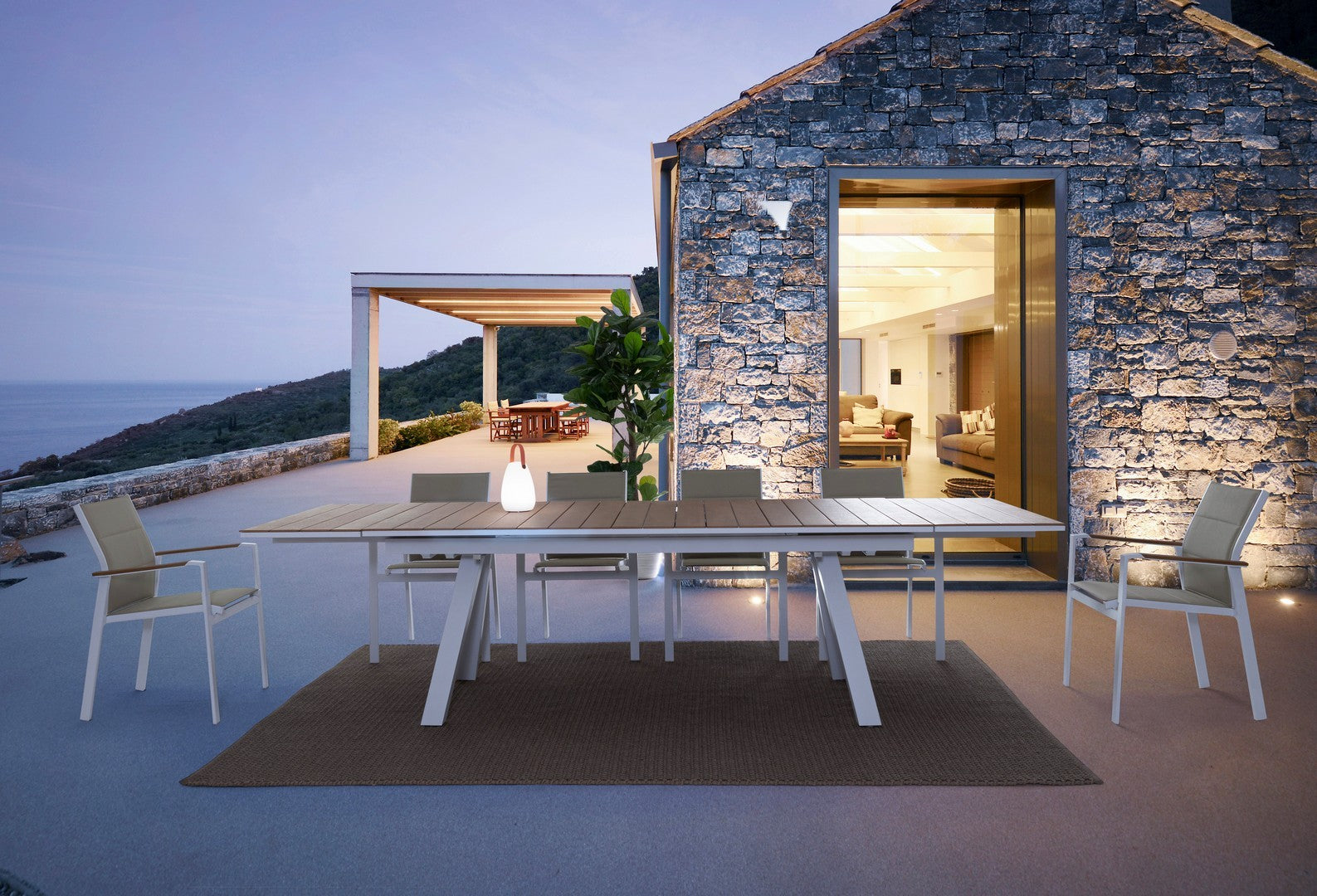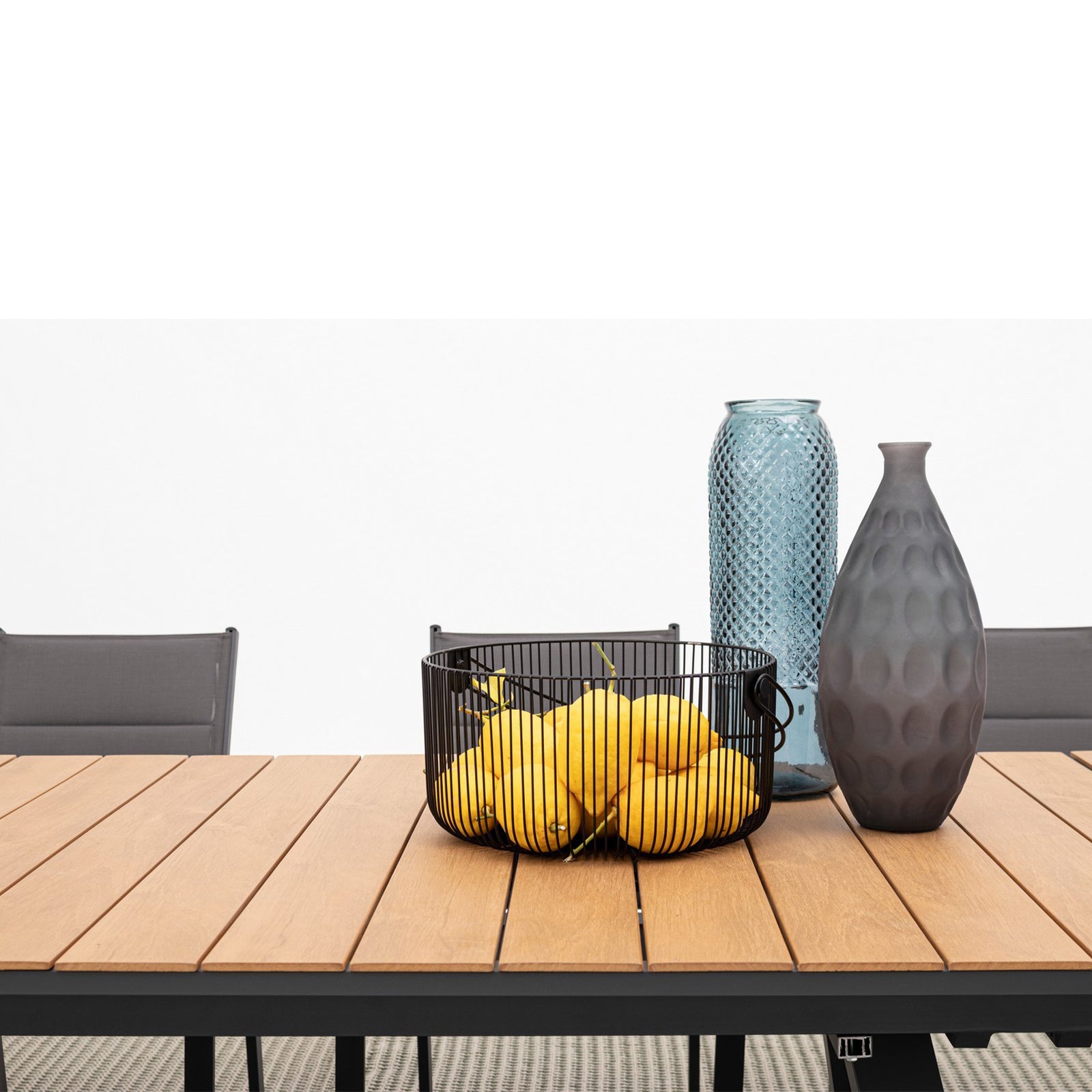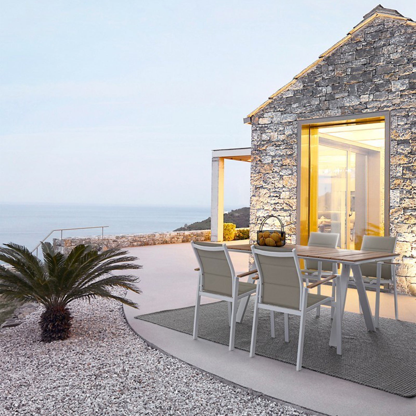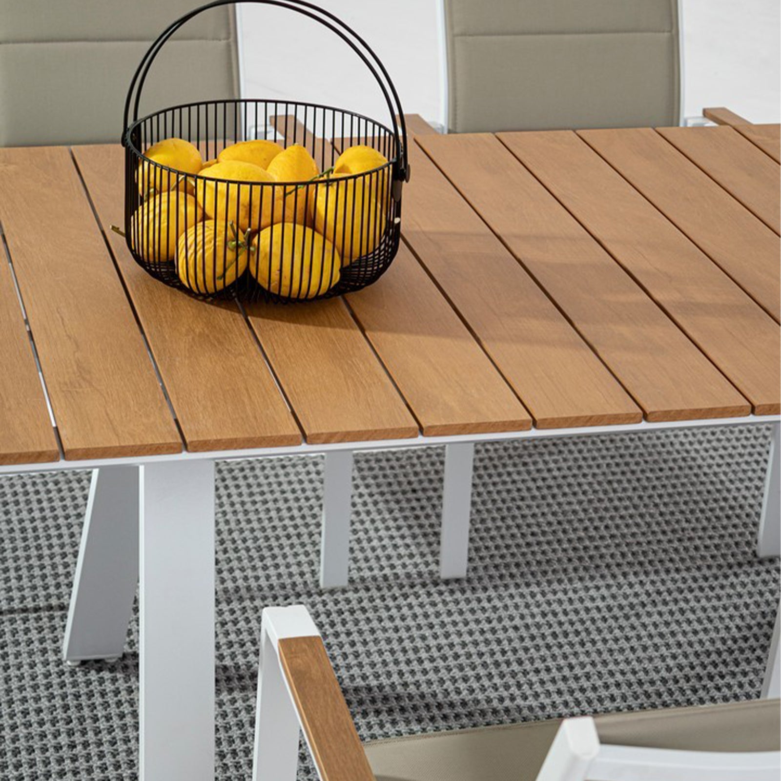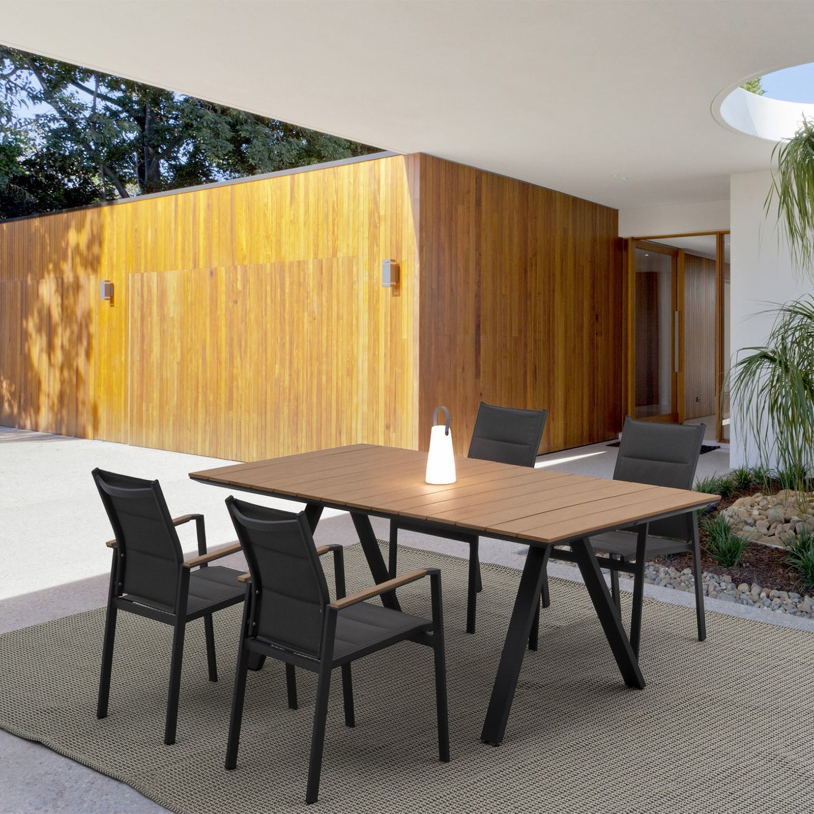 I braccioli, gli inserti delle sedie e del tavolino sono in Polywood