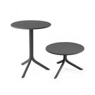 Tavolino d’appoggio in resina fiberglass con piano rotondo e base a tre gambe adatto all’esterno ma perfetto anche come complemento d’arredo indoor.