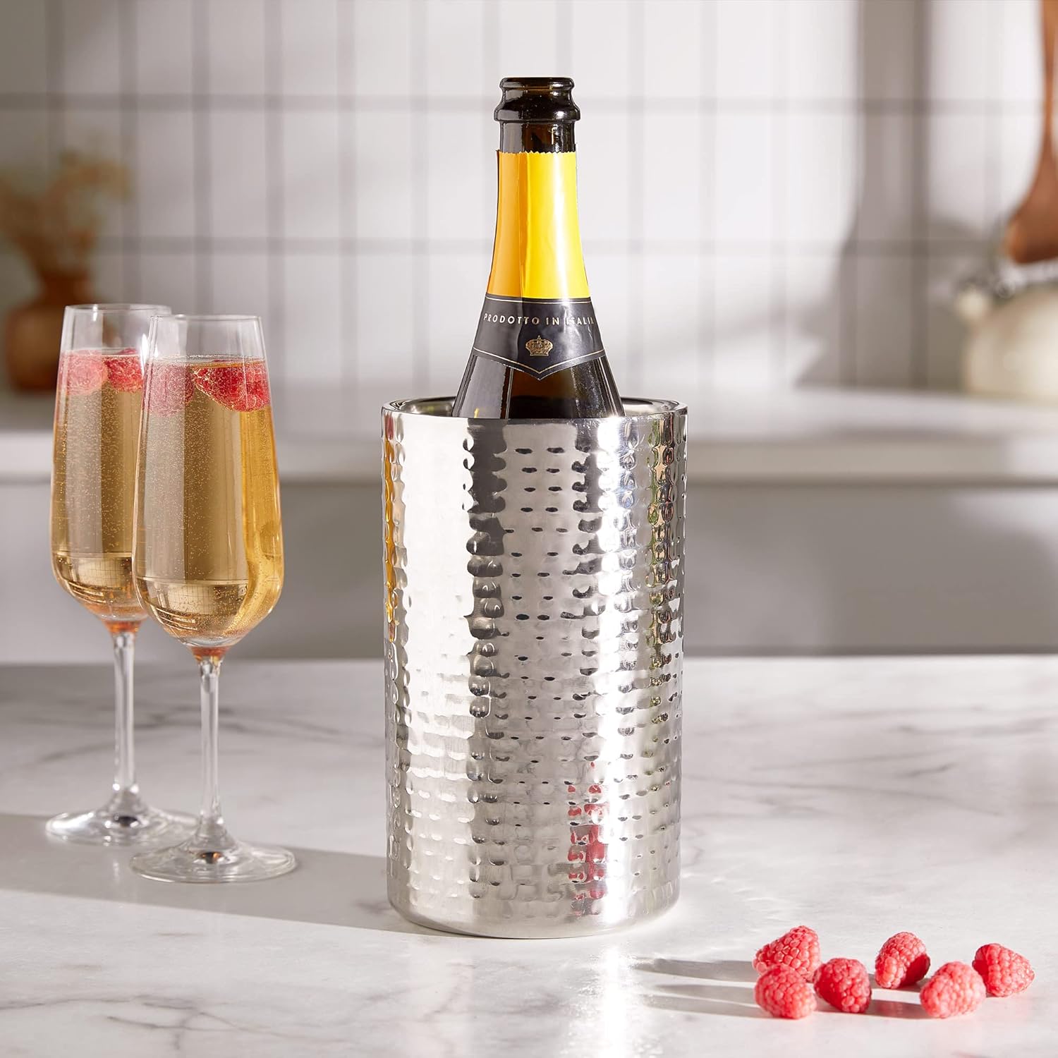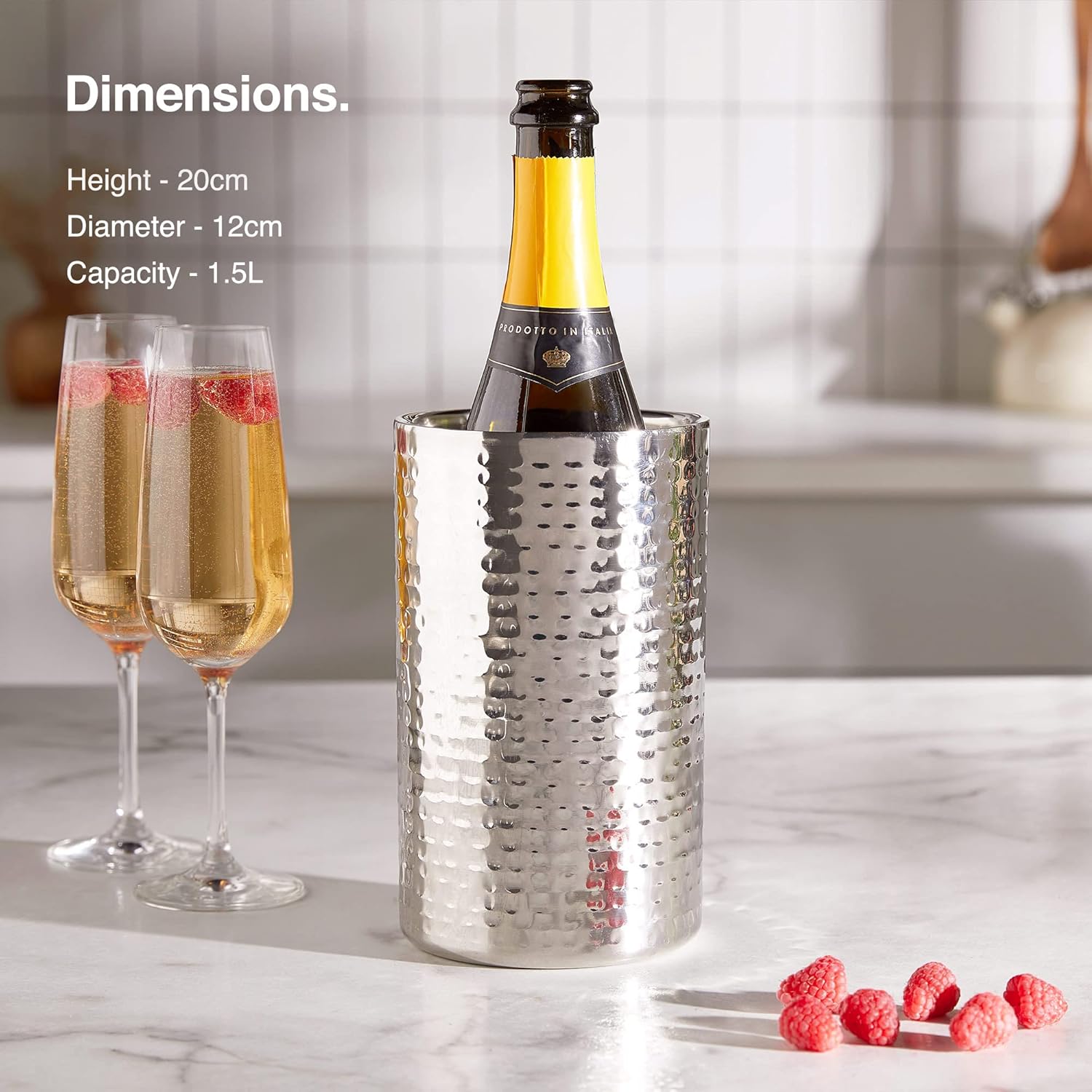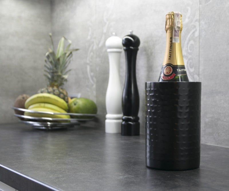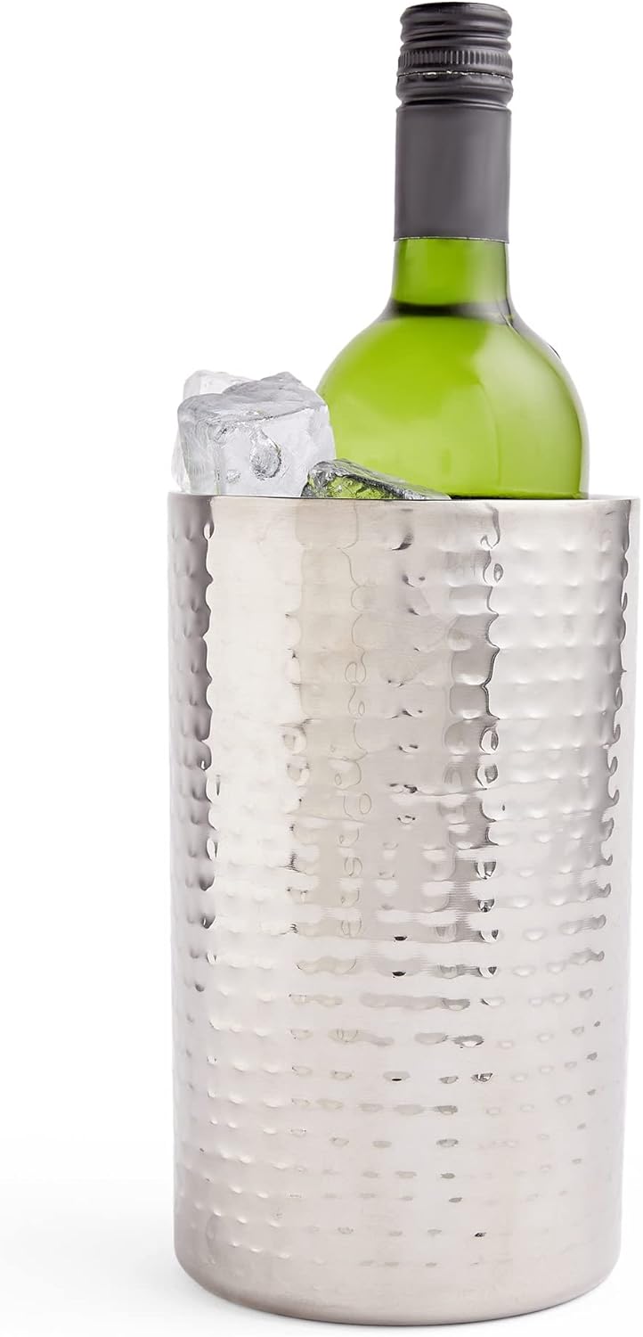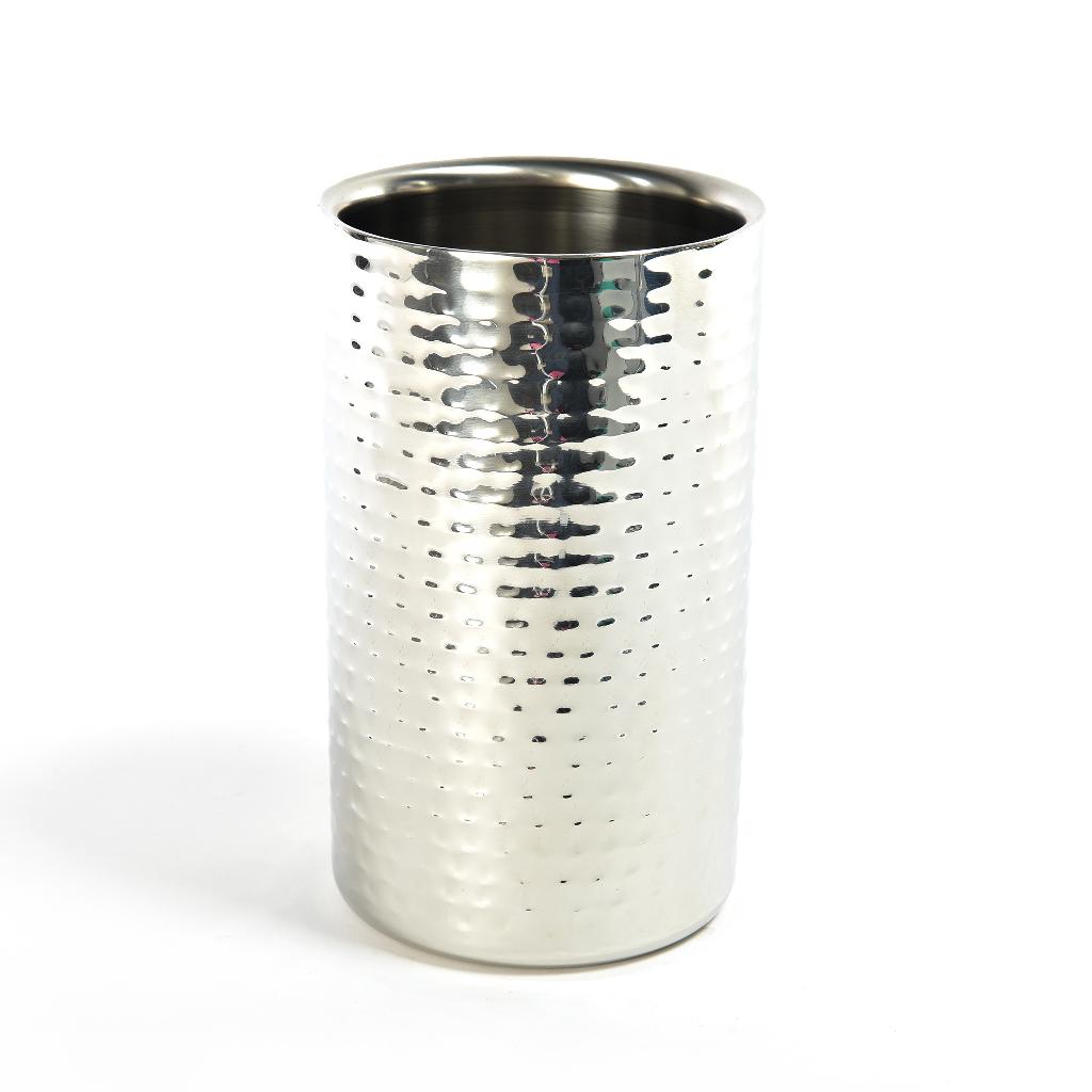 Elegante e raffinato, questo porta bottiglia in acciaio inox martellato è il complemento perfetto per arricchire la tua tavola durante pranzi e cene speciali.