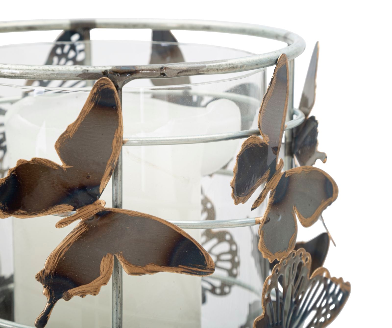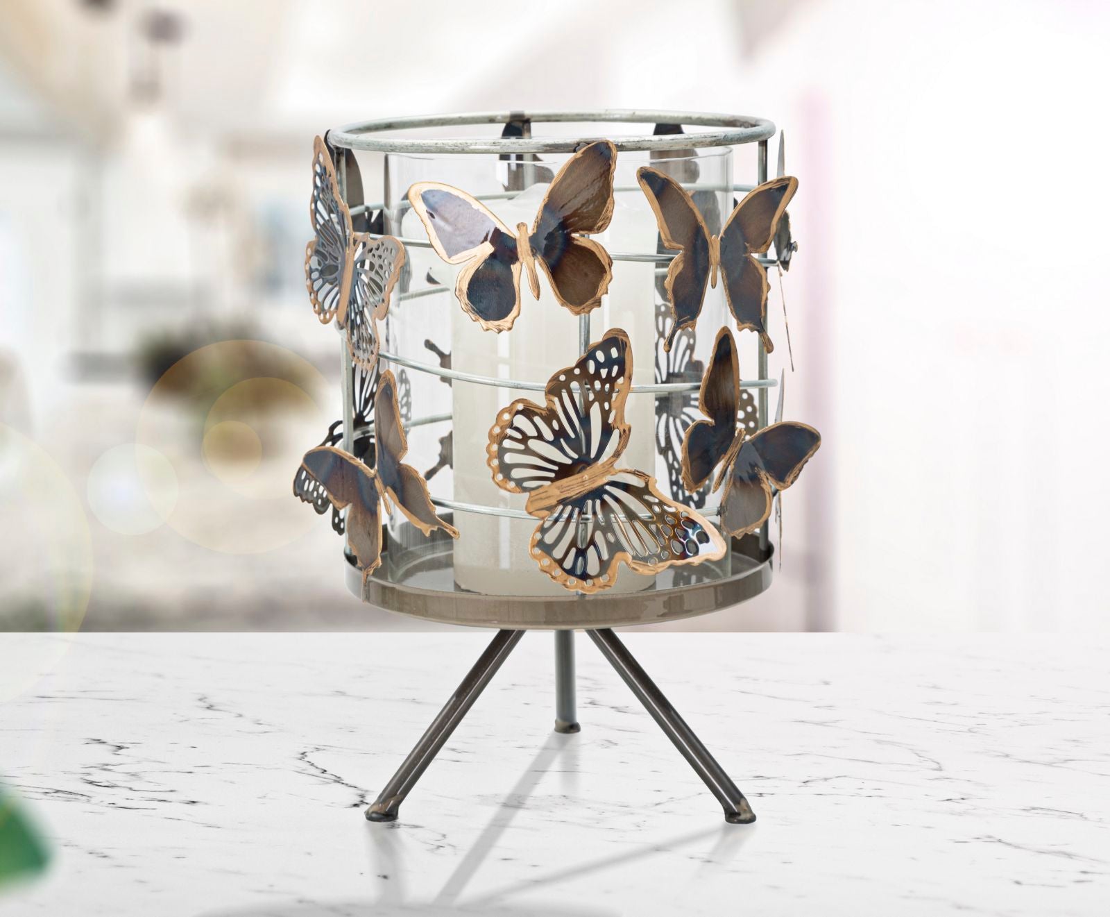 Il porta candela con struttura in metallo decorato con farfalle è un accessorio d'arredo delicato e poetico, pensato per aggiungere un tocco di leggerezza e natura agli ambienti interni.
