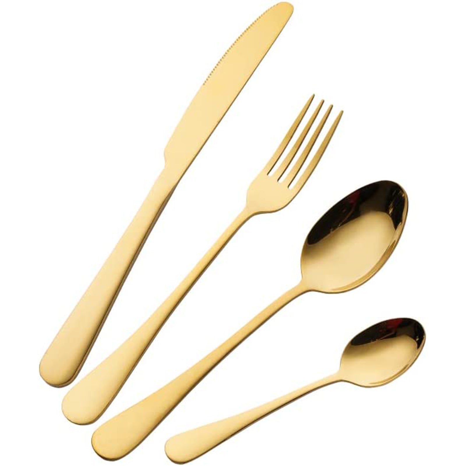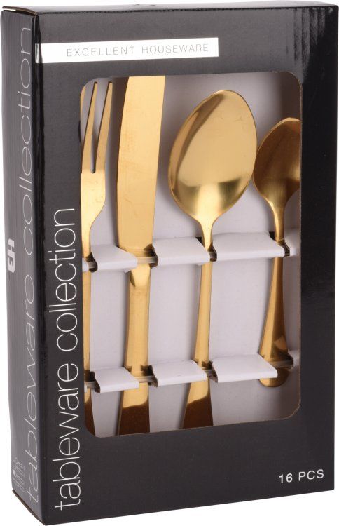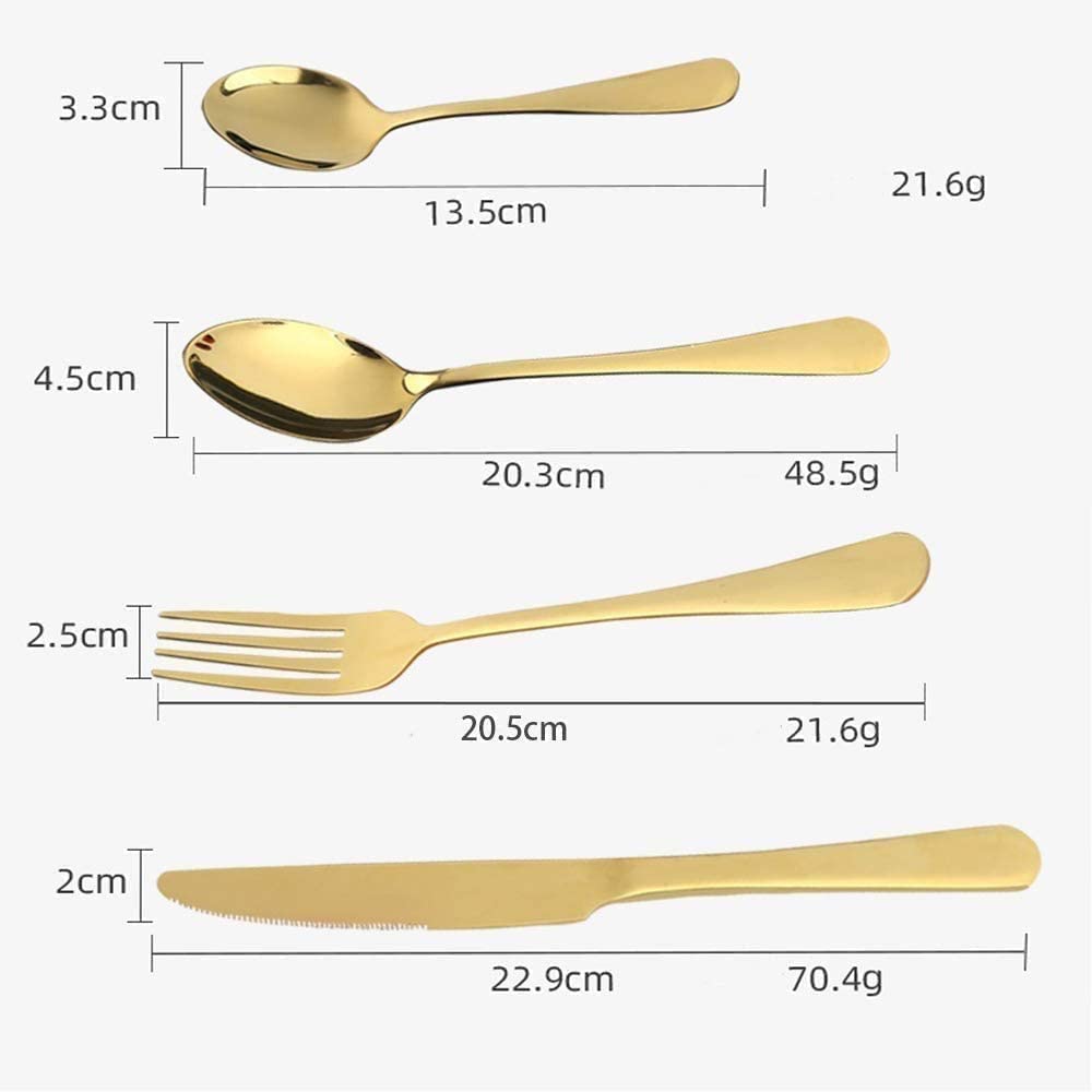 Il Servizio di posate in acciaio inox dorate 16 pezzi per 4 persone è composto da 16 pezzi di posate, tra cui 4 forchette, 4 coltelli, 4 cucchiai grandi e 4 cucchiai piccoli.