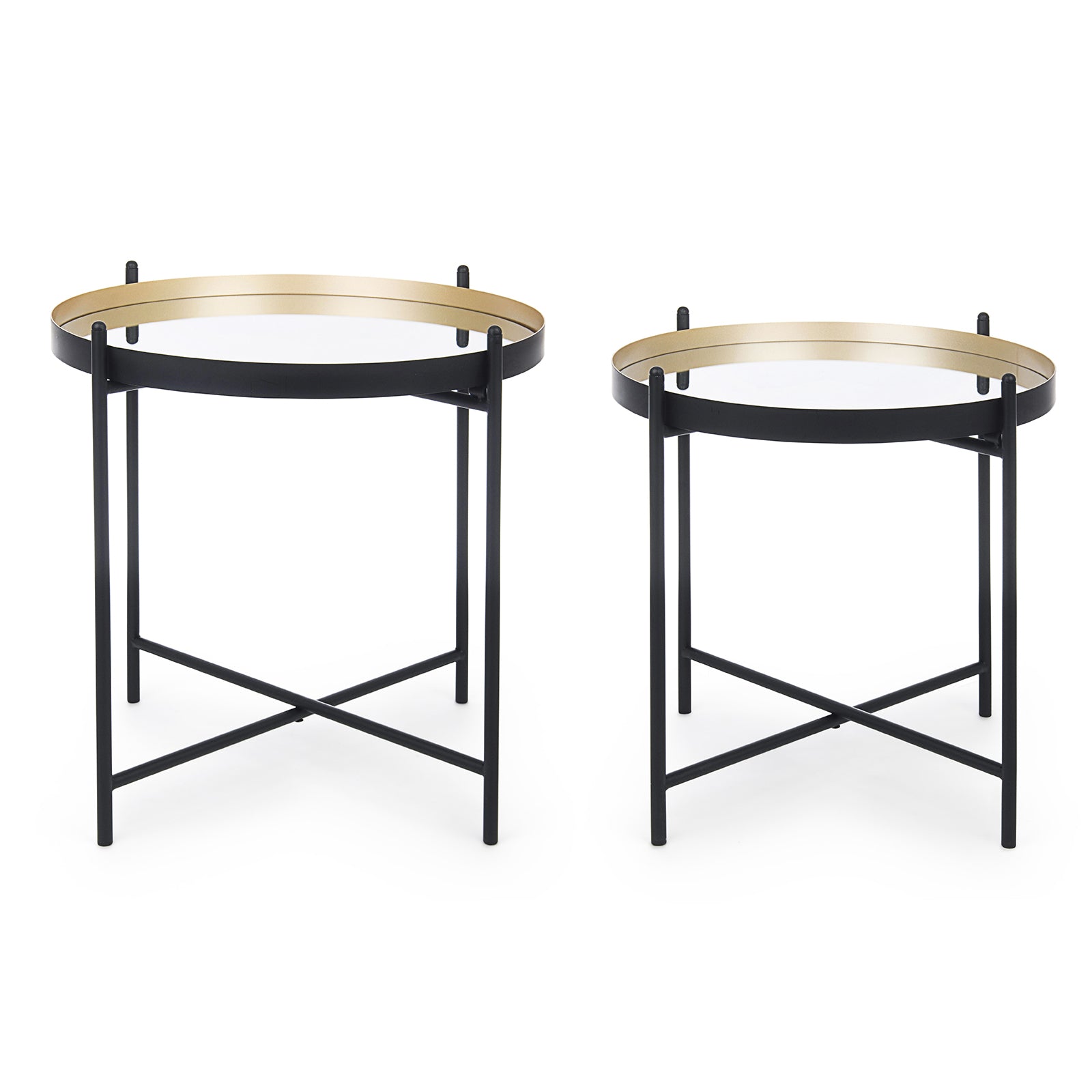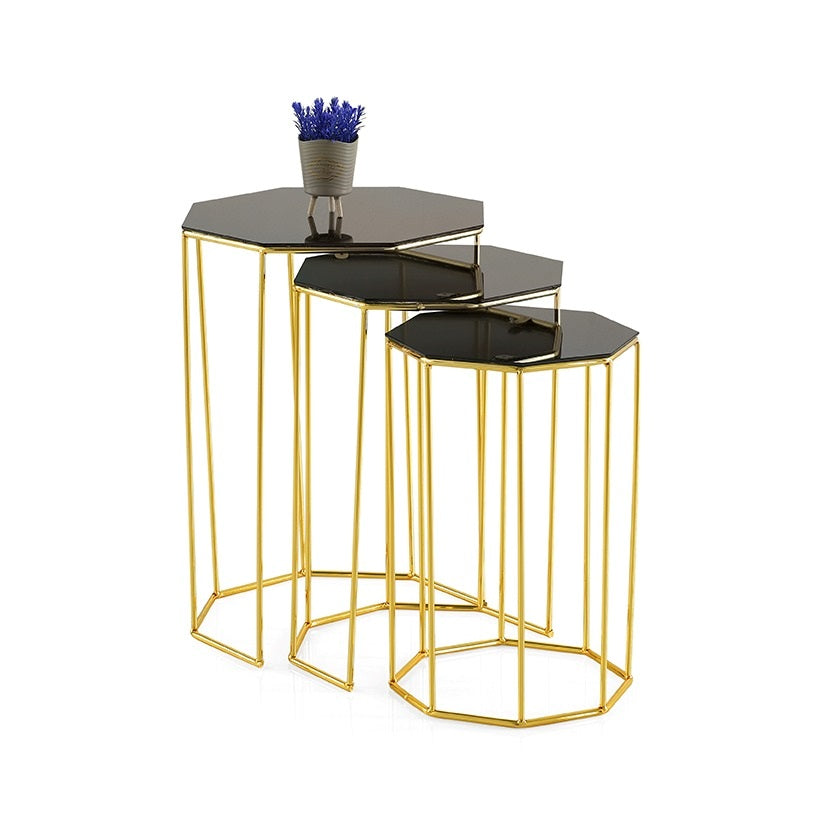 Set 3 Tavolini esagonali da salotto moderno in metallo con piano in vetro