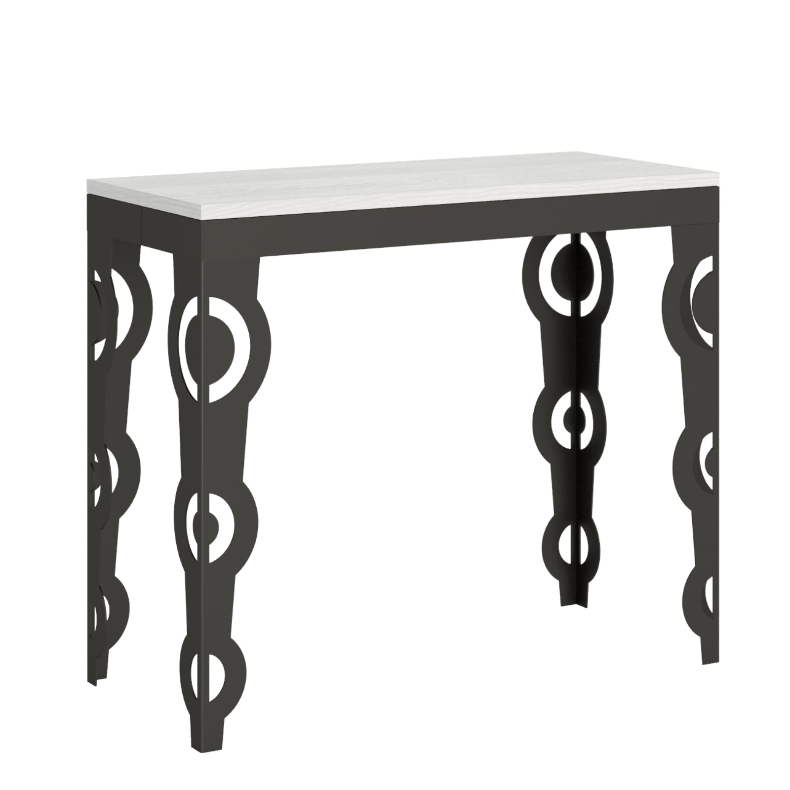 Quando non è allungato, il tavolo consolle "Como" può essere posizionato contro una parete o utilizzato come una consolle per l'appoggio di oggetti decorativi o come piano di lavoro aggiuntivo. Tuttavia, quando è necessario ospitare più persone a tavola, il meccanismo di allungamento consente di trasformare la consolle in un tavolo da pranzo più ampio e accogliente.