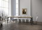 L'estensione del tavolo avviene in modo semplice e intuitivo: basta aprire la parte centrale del tavolo estraendo le sezioni aggiuntive, che possono essere fissate stabilmente per creare una superficie più ampia.
