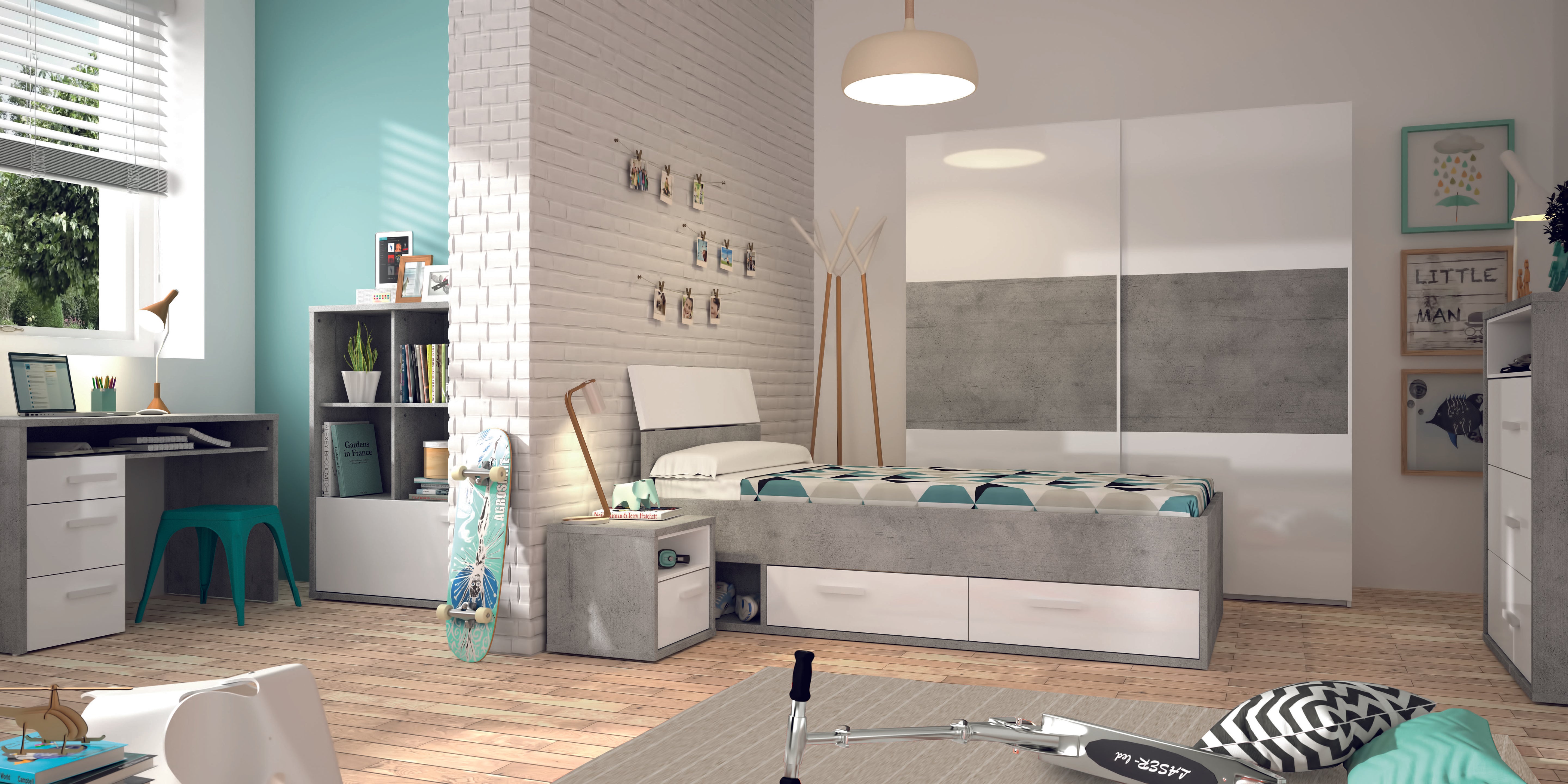 Libreria bassa a tre vani color grigio cemento, della linea "Mi Piace".