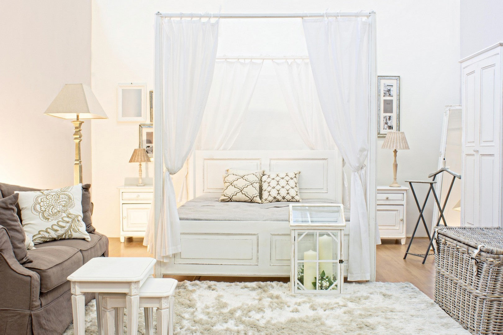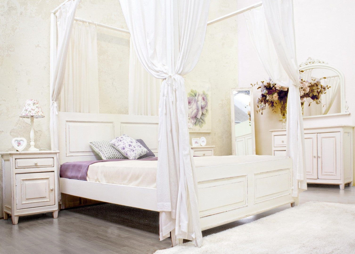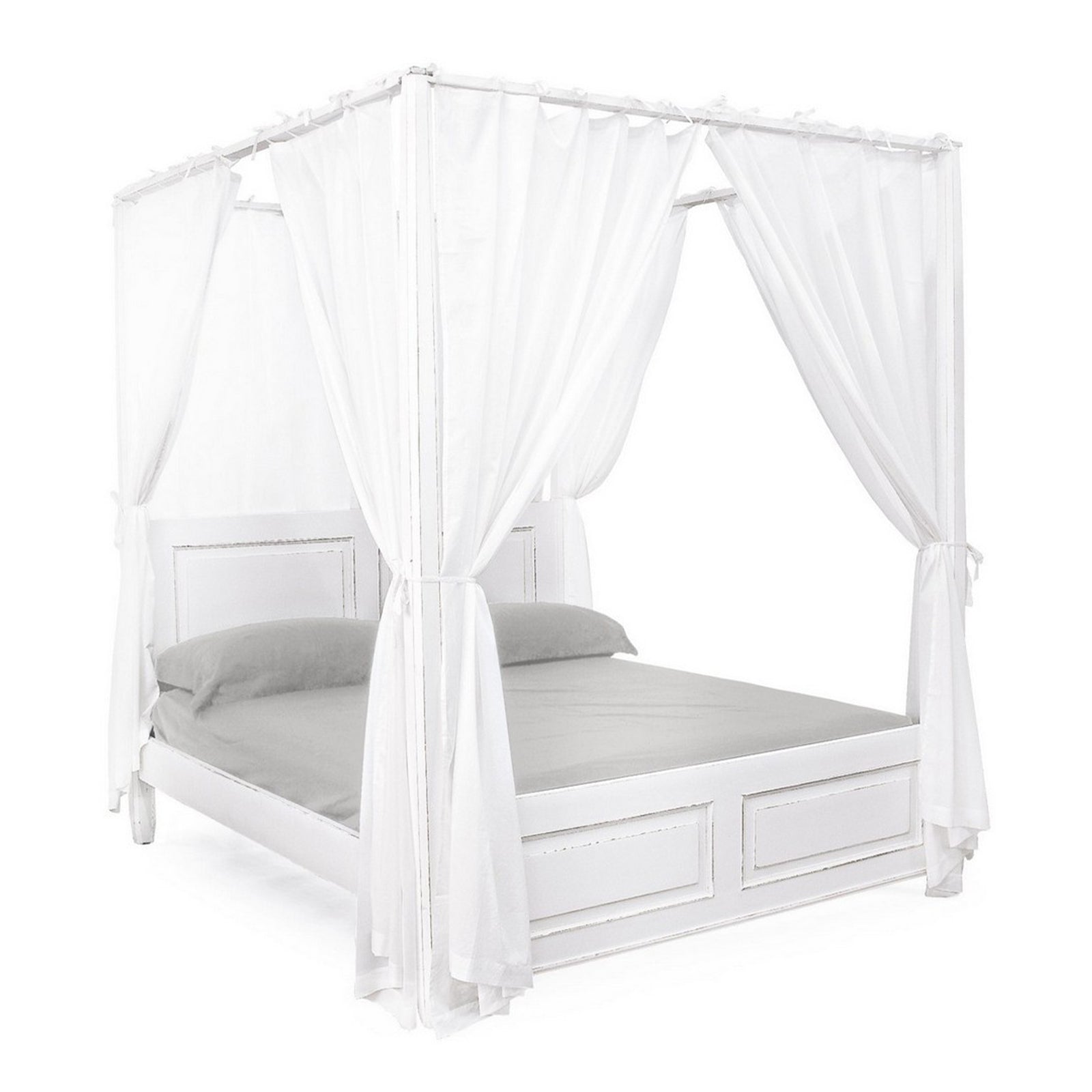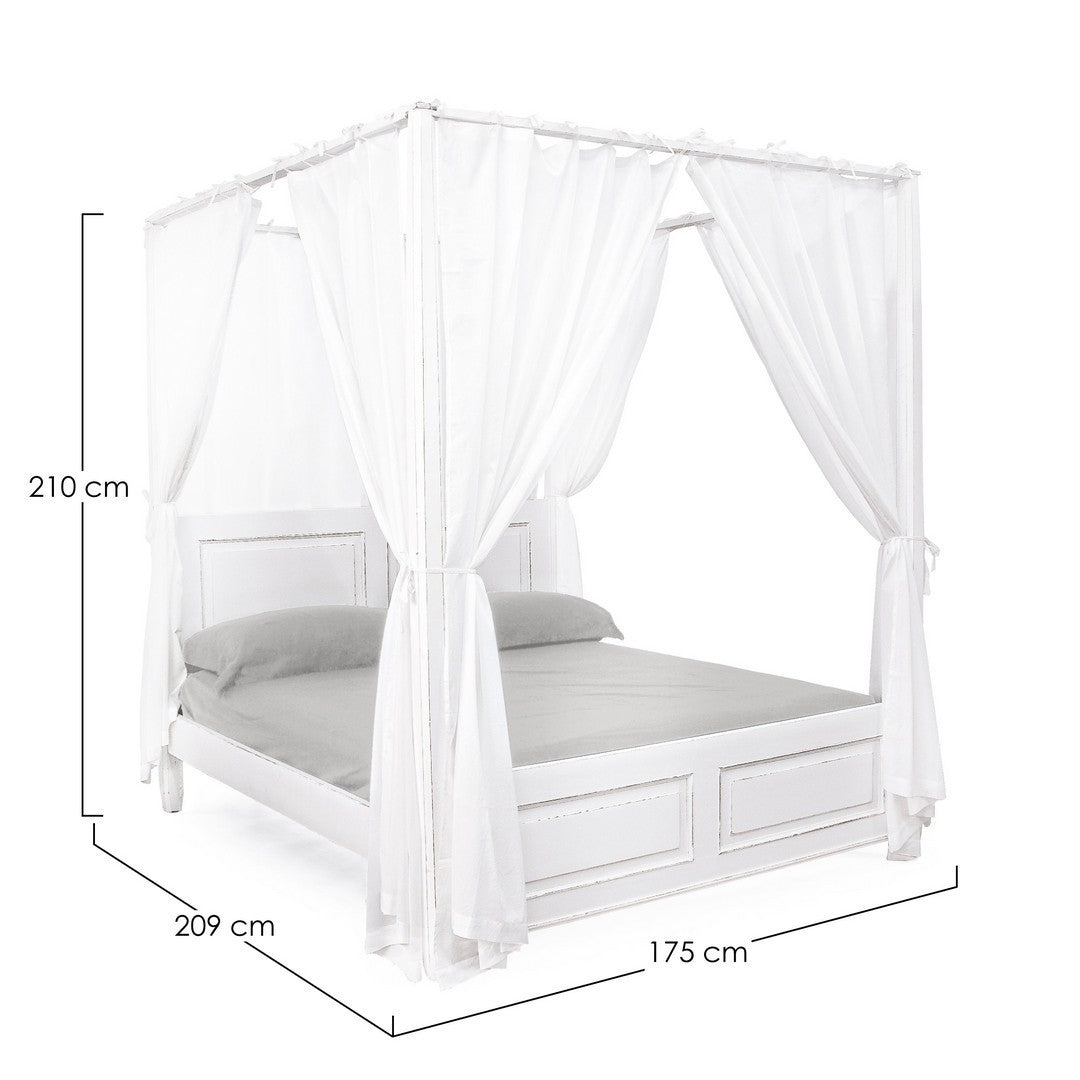 Letto a due posti "Colette" con tende, struttura in legno di mango, stile moderno