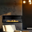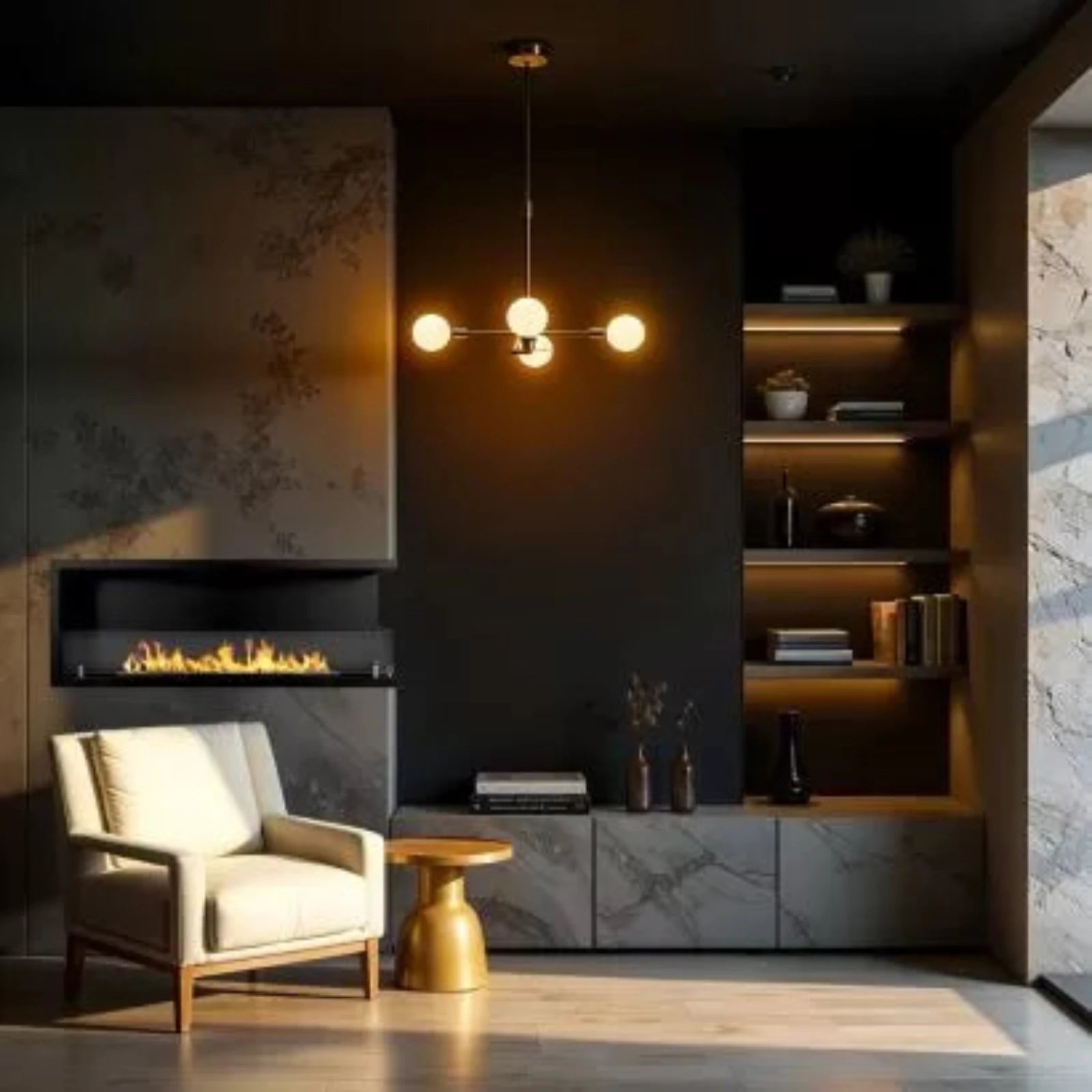 Il camino a bioetanolo "Sutri 120 DX" è progettato per installazioni ad angolo sul lato destro, offrendo un tocco di eleganza e funzionalità per riscaldare gli spazi in modo ecologico e moderno.