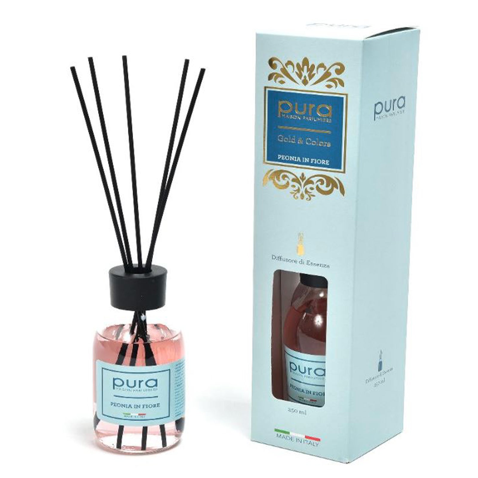 Questo elegante diffusore è contenuto in un flacone da 250 ml, caratterizzato da un design lussuoso e raffinato che riflette l'essenza premium del prodotto. Il flacone, realizzato con materiali di alta qualità, presenta finiture dorate che aggiungono un tocco di eleganza e opulenza, rendendolo un elemento decorativo perfetto per qualsiasi stile di arredamento.