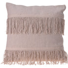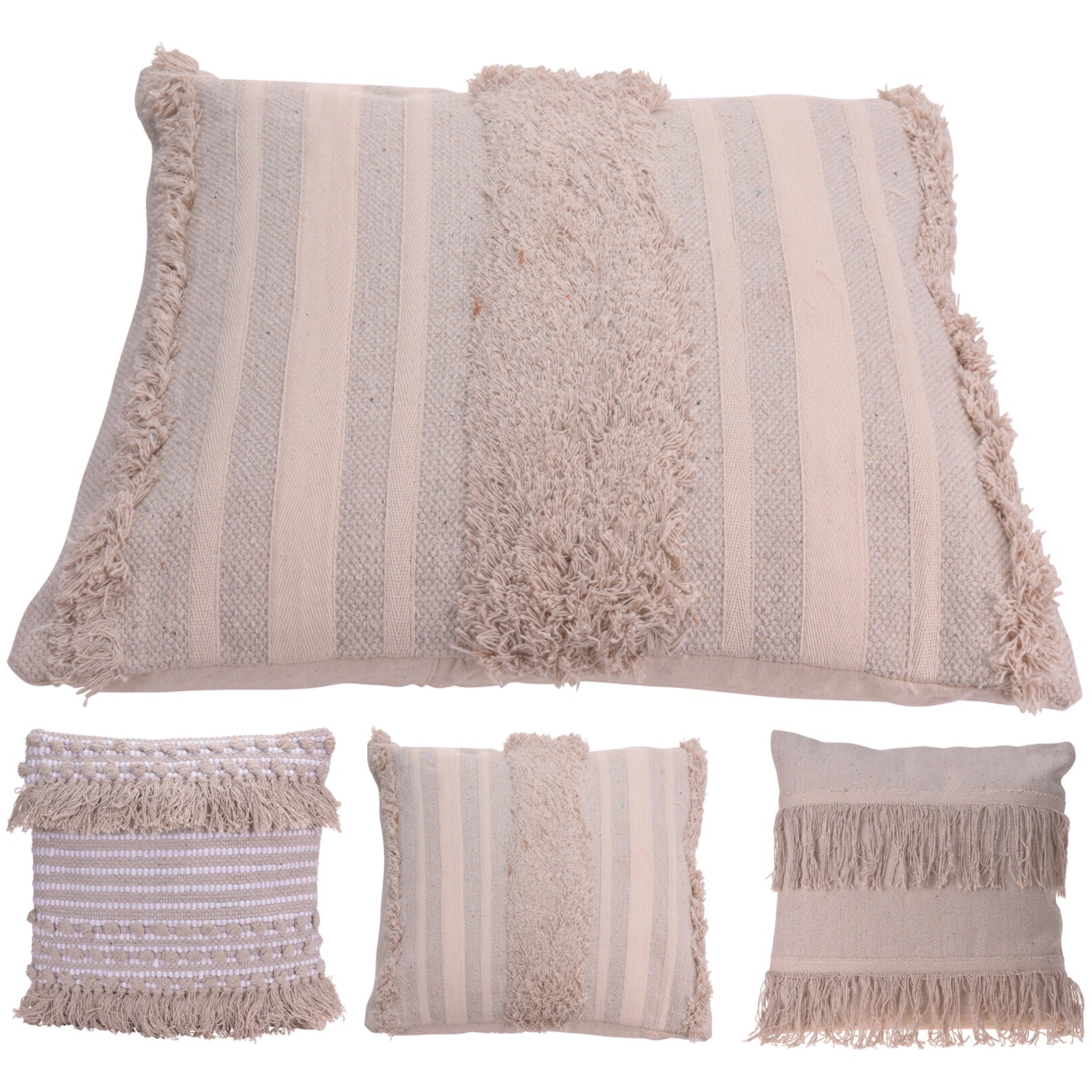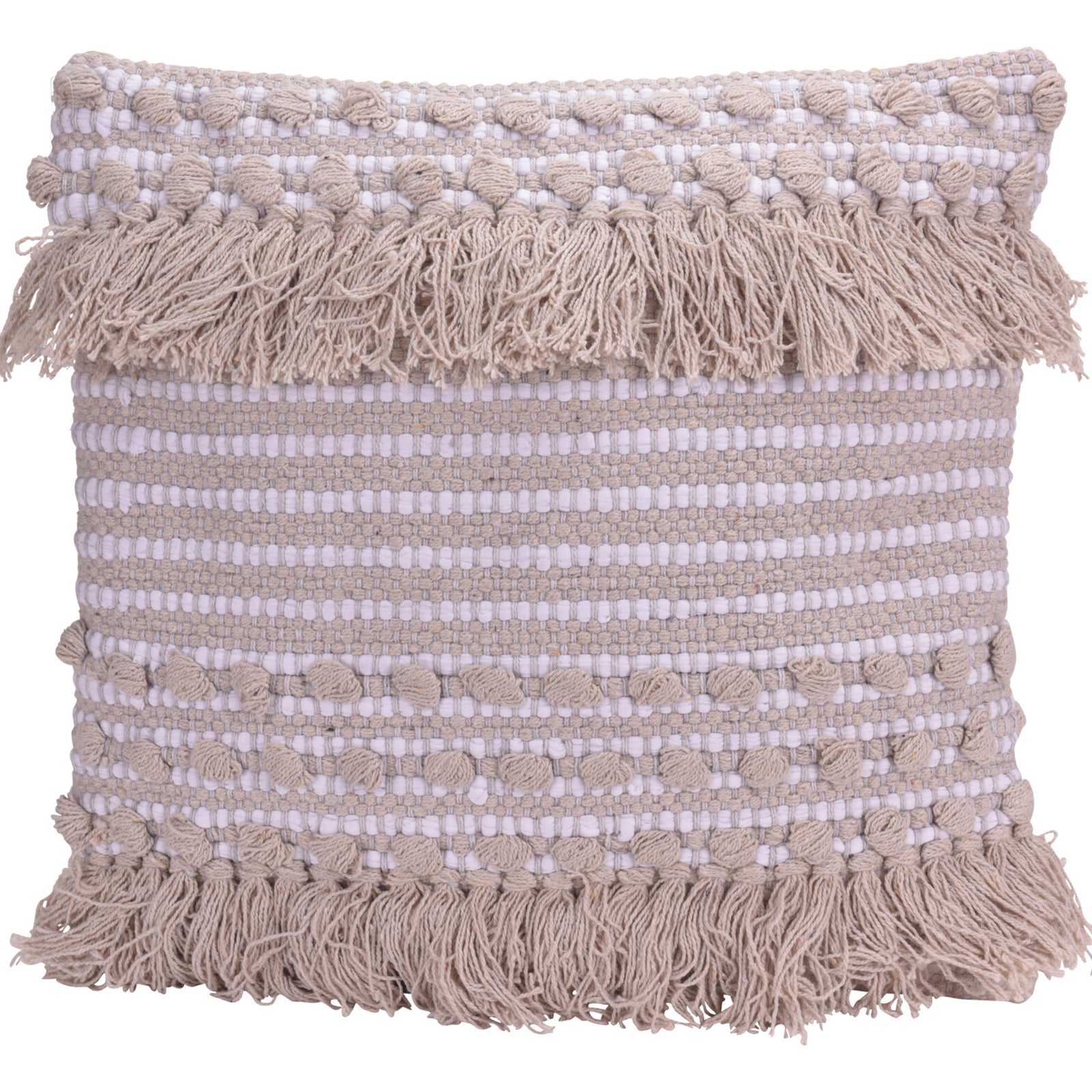 Realizzato in India con materiali di alta qualità, questo cuscino ha una dimensione di 45 x 45 cm ed è disponibile in 3 diverse varianti: beige con frange, beige con pom pom e frange, e beige con righe panna.