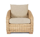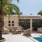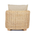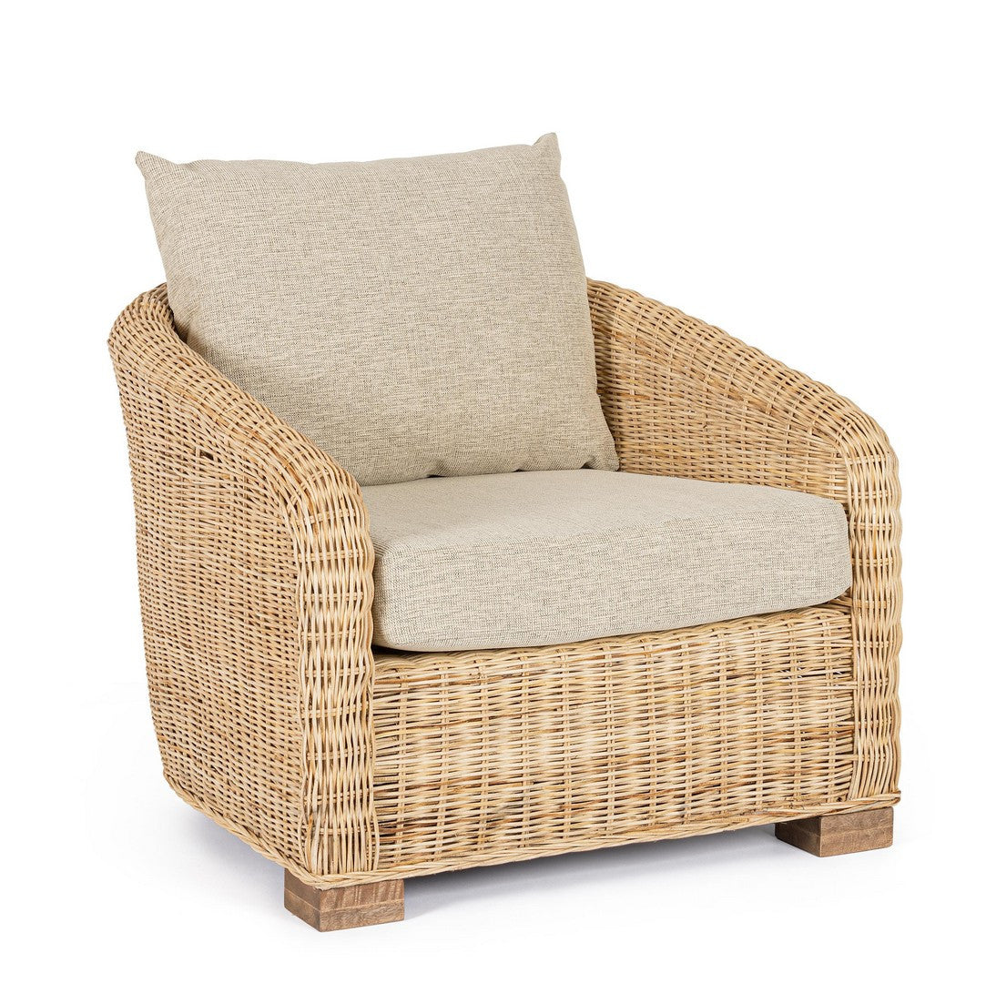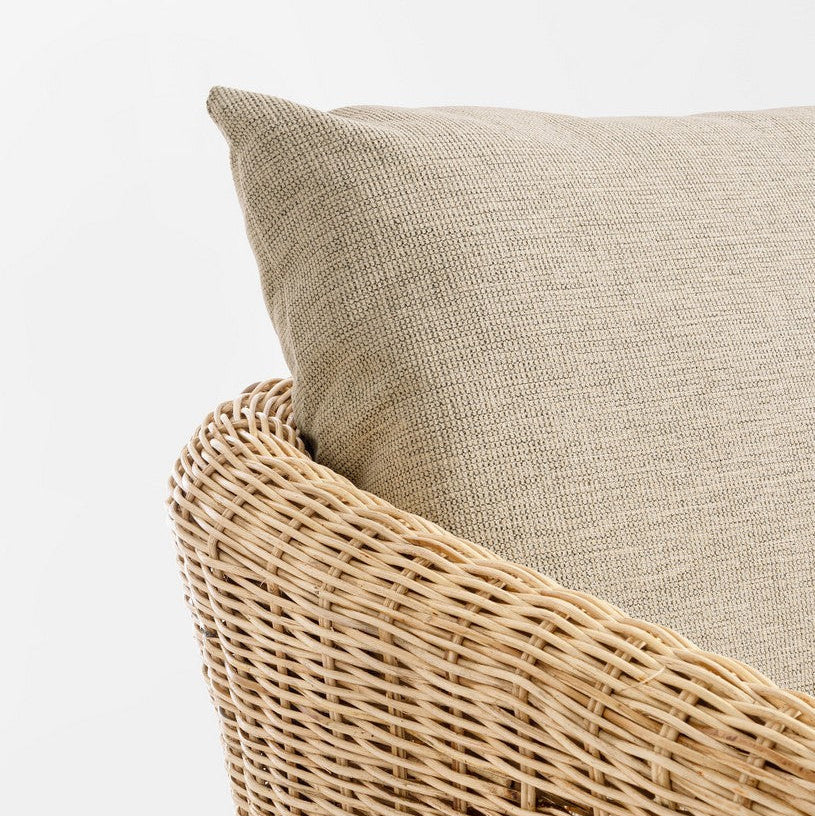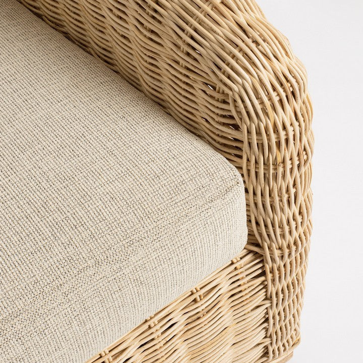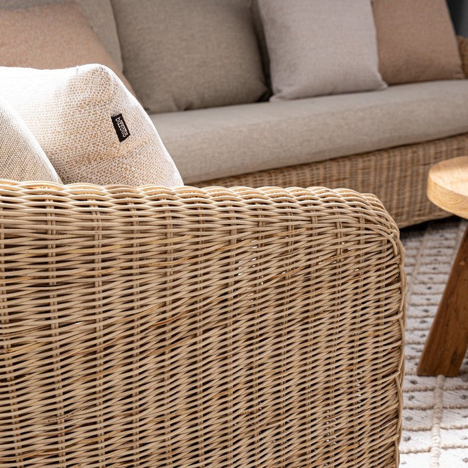 La struttura in rattan, intrecciata a mano, conferisce al divano un aspetto caldo e accogliente, aggiungendo una texture unica che richiama un design esotico e raffinato.