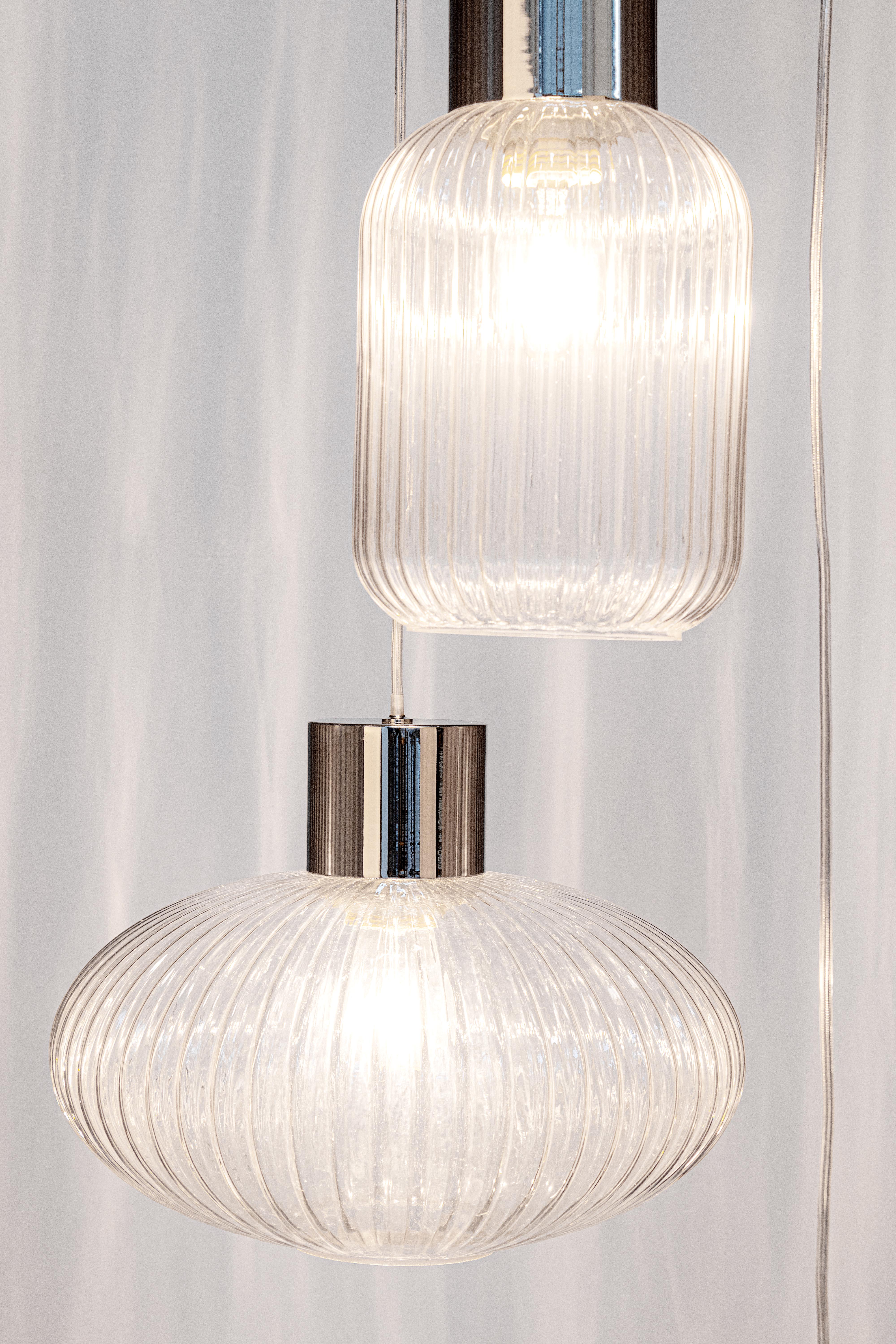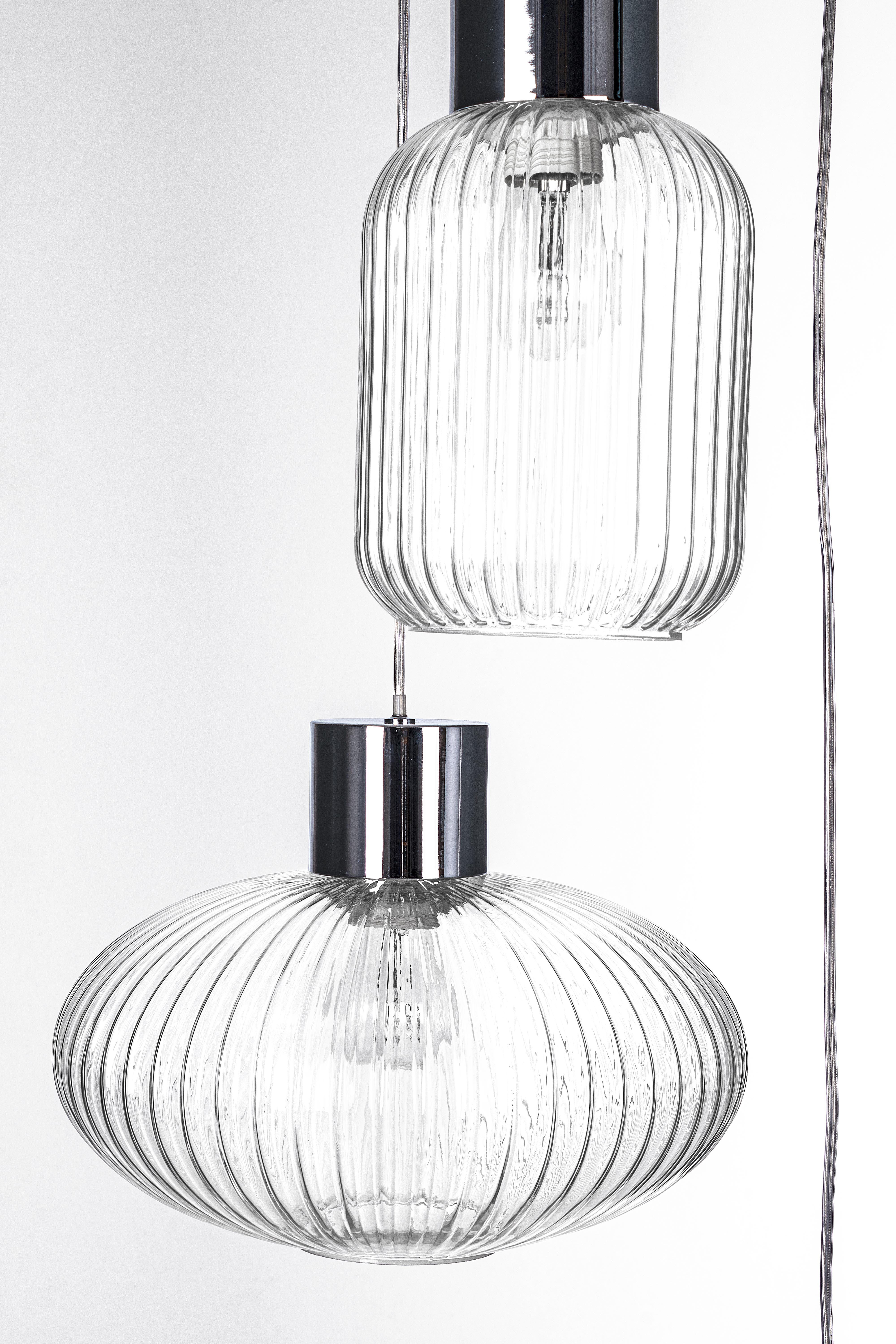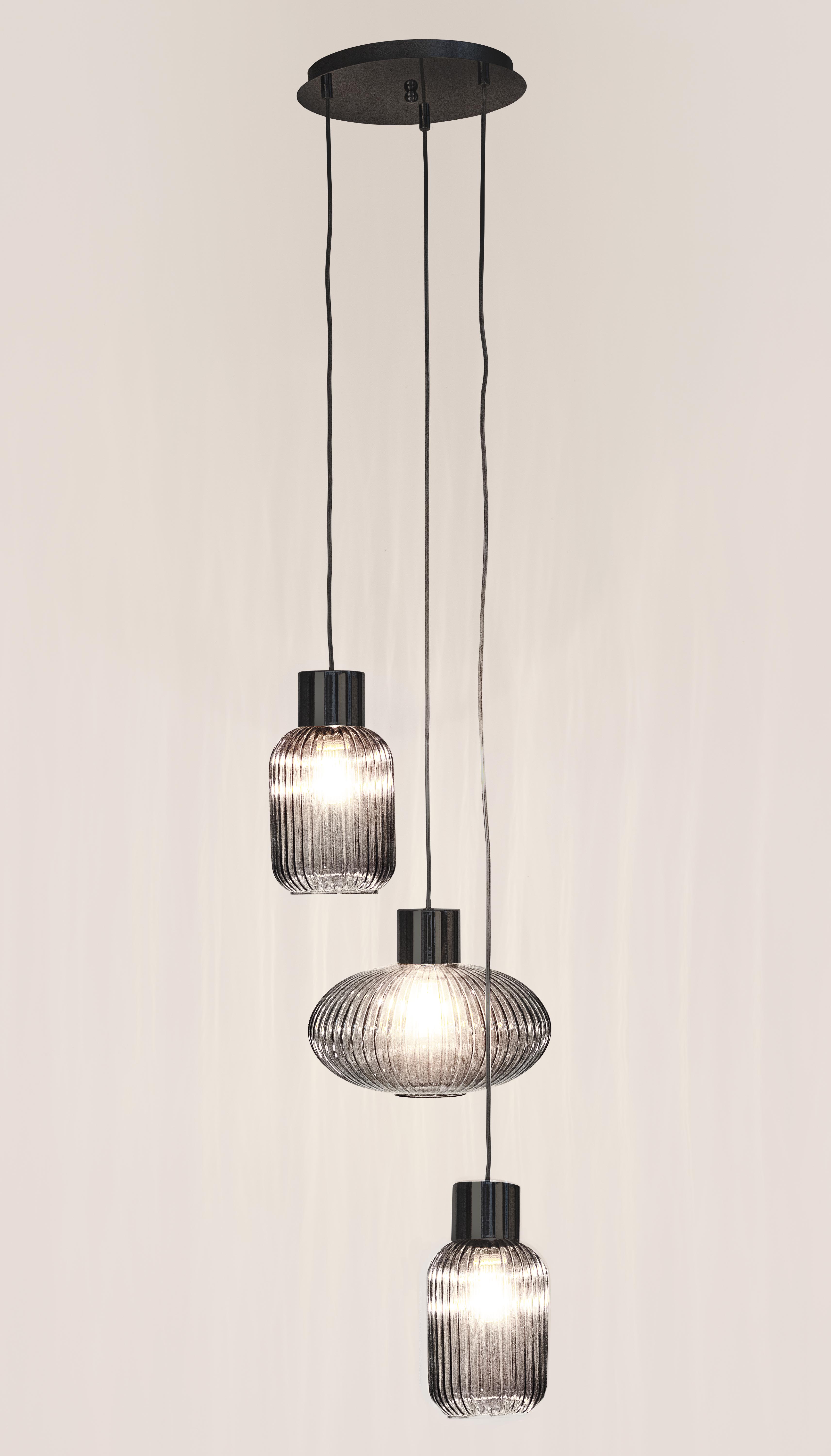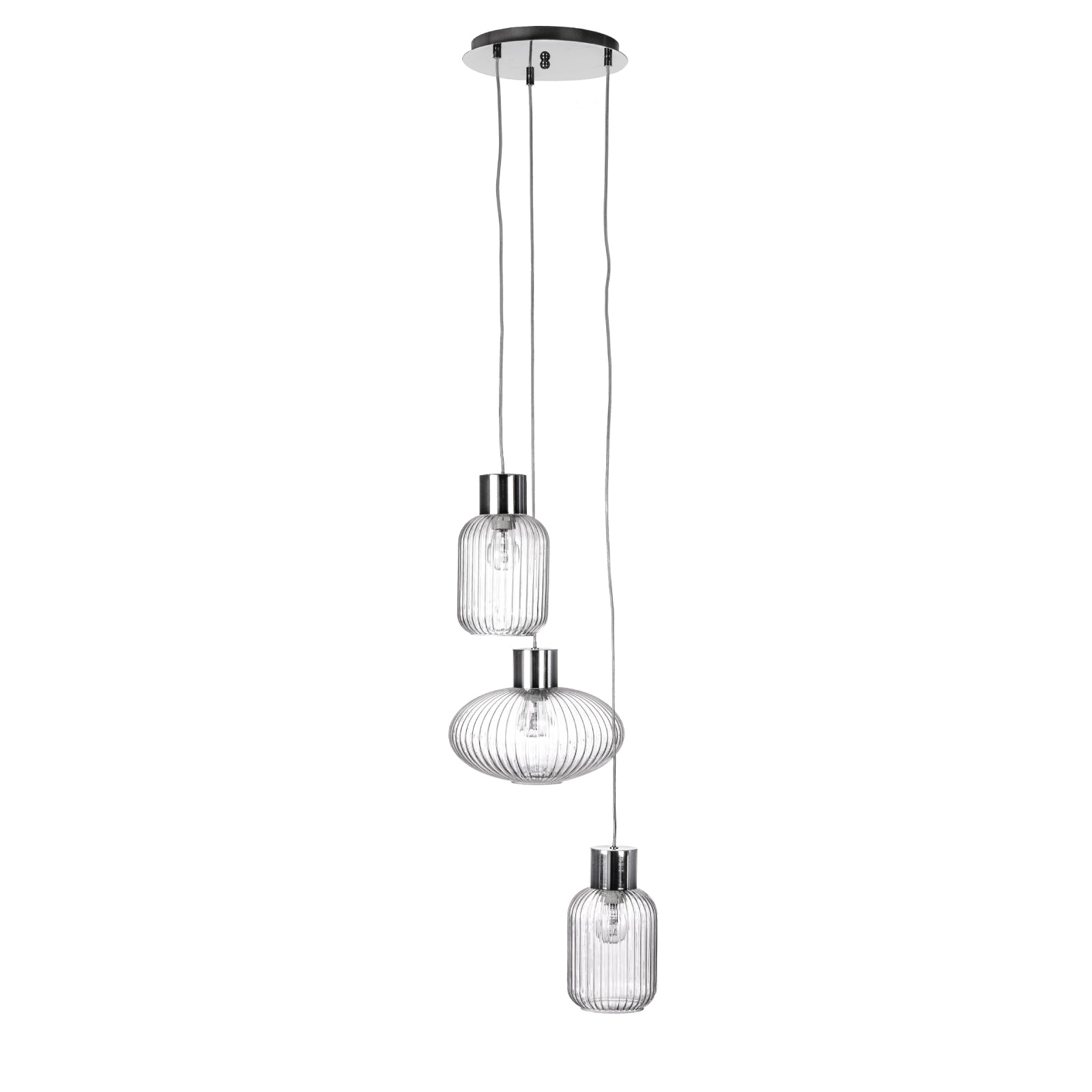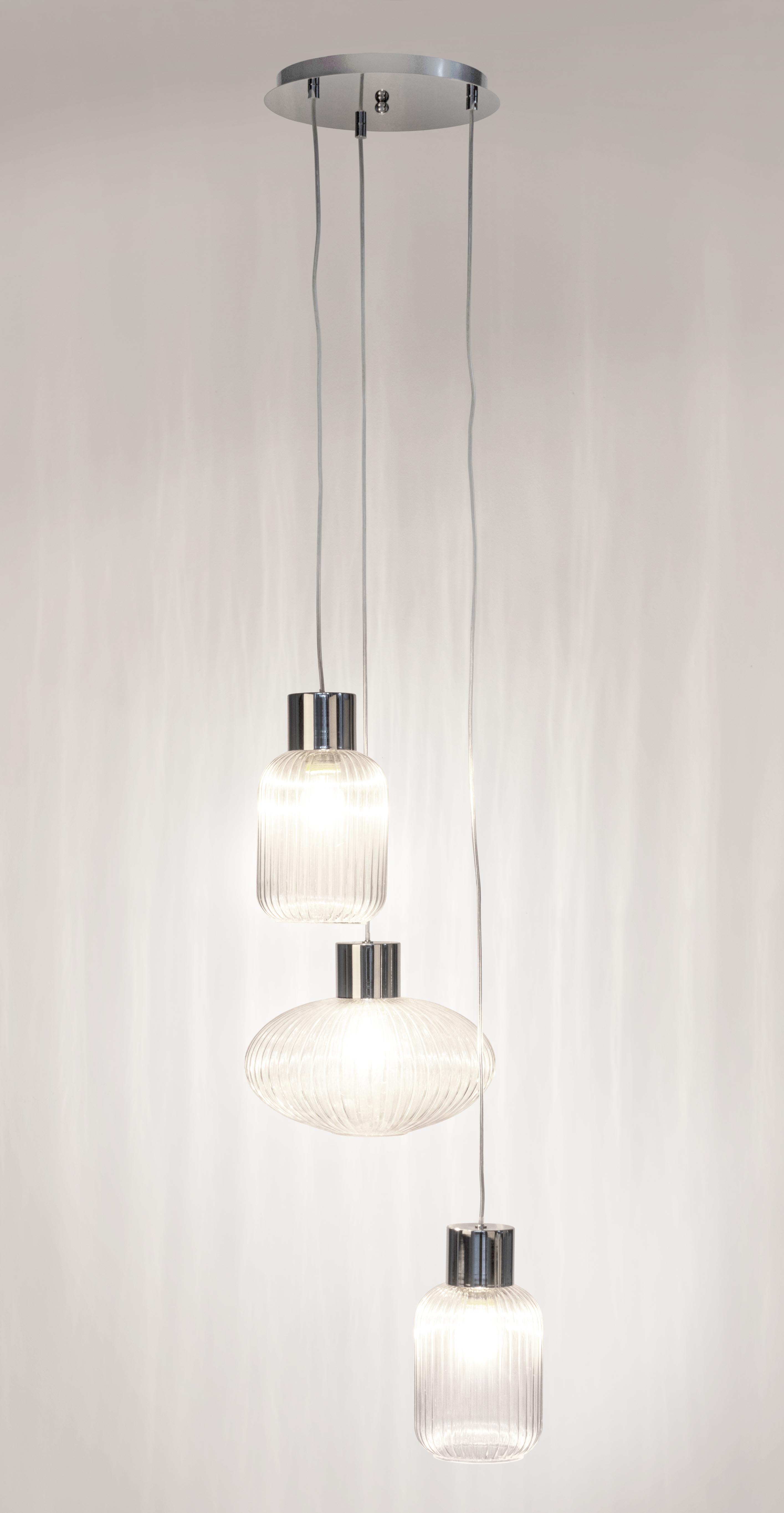 Il lampadario "Showy" a 3 luci presenta un design elegante e contemporaneo, combinando l'acciaio e il vetro per creare un pezzo d'illuminazione raffinato.