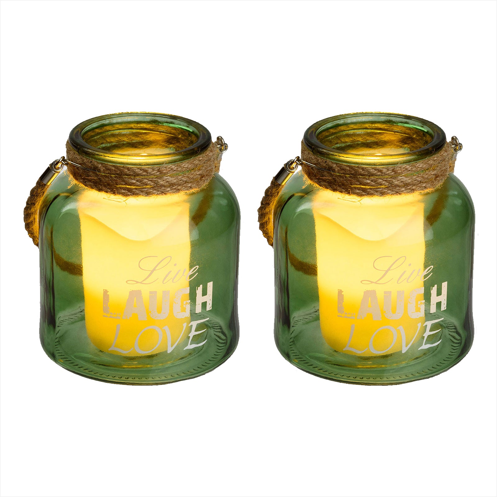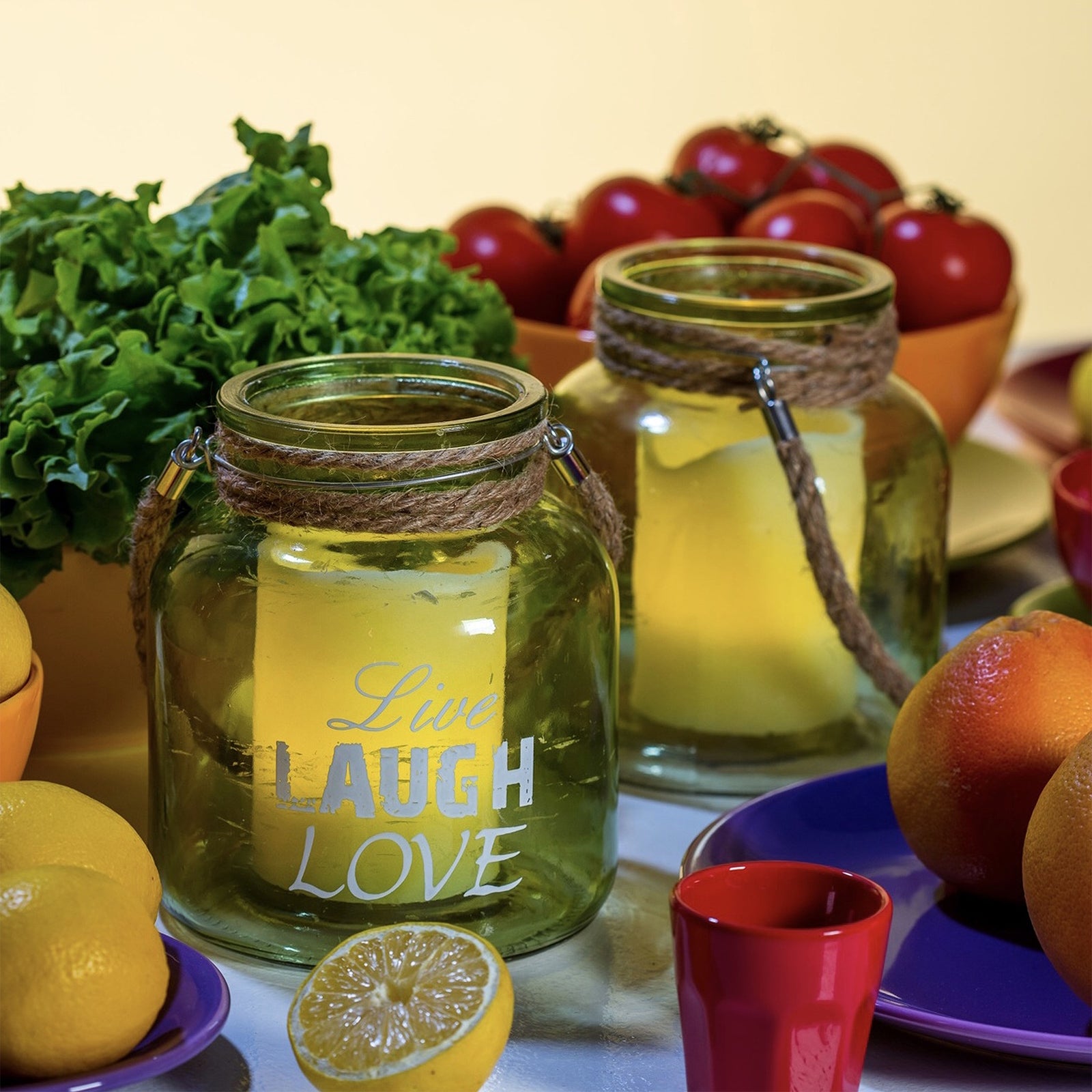 Vasetto in vetro con candela a led con scritte per arredamento da interno.