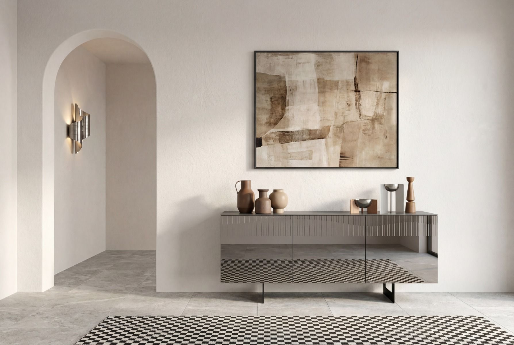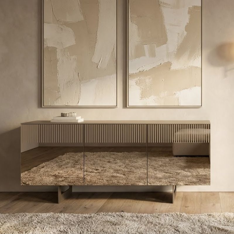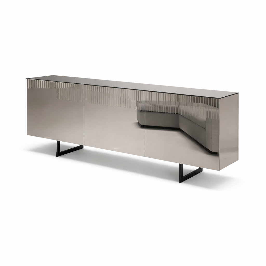 Le ante specchiate amplificano la luce e donano profondità allo spazio, mentre l’inserto cannettè aggiunge un dettaglio ricercato e distintivo.