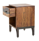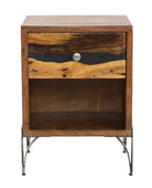 Questo comodino presenta una combinazione di materiali che include il legno di acacia e il metallo, creando un design che mescola elementi naturali con dettagli moderni.