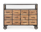 La cassettiera "Mindil" rappresenta un'armoniosa fusione tra materiali industriali e naturali, combinando una solida struttura in acciaio con cassetti in legno di abete e MDF.