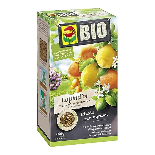 Nutri le tue piante in modo naturale con COMPO BIO Lupind’or Plus 800, il concime organico a base di lupini ideale per limoni, aranci, mandarini, pompelmi, cedri e tutte le piante acidofile.