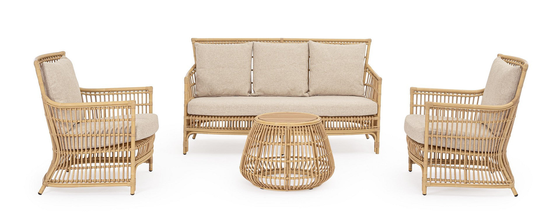 La seduta, ampia e comoda, è impreziosita da cuscini morbidi e avvolgenti, realizzati con materiali resistenti all'acqua e facili da pulire, che garantiscono un comfort duraturo anche nelle giornate più calde o piovose.