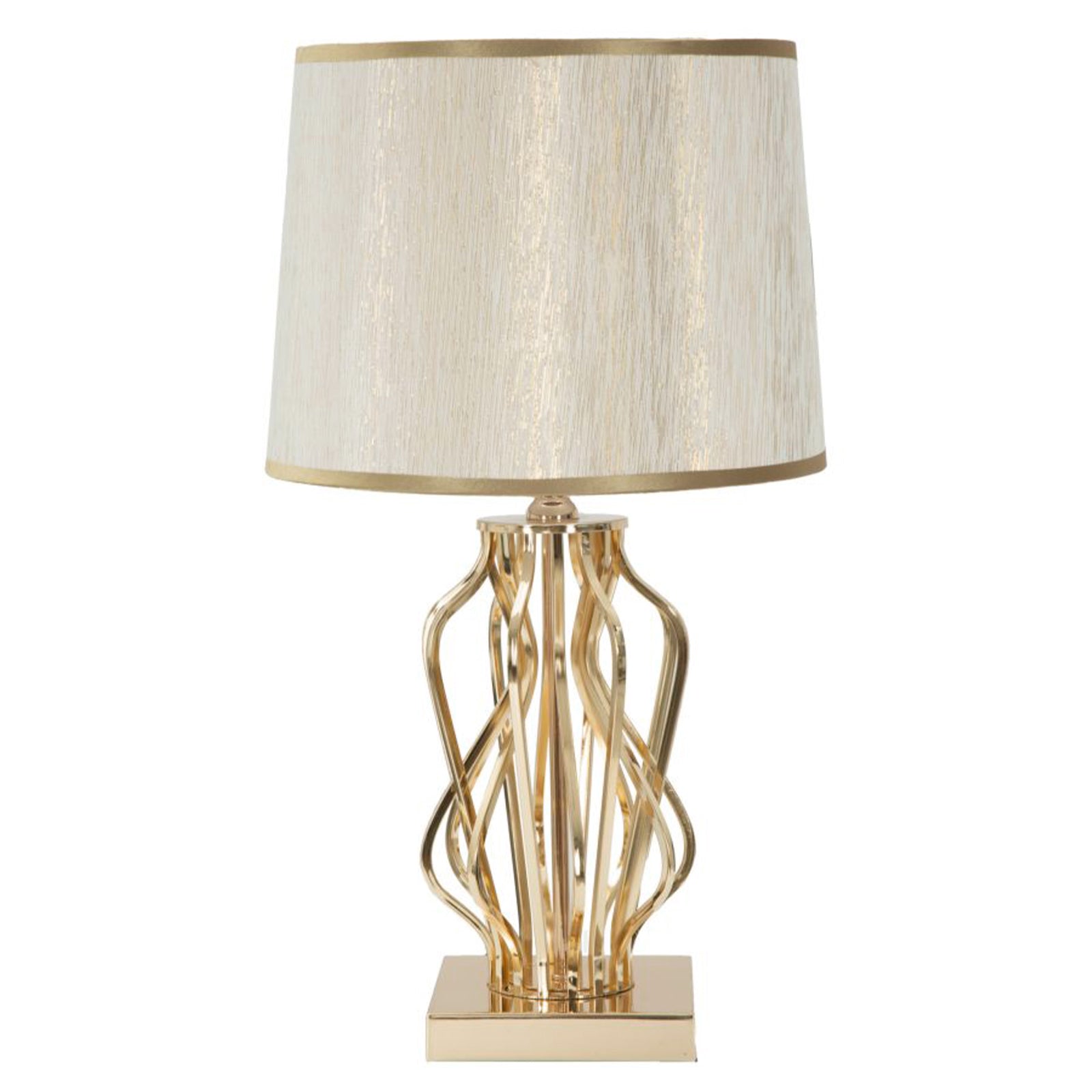 La lampada con struttura in metallo e poliestere di colore crema e oro per interni è un raffinato accessorio di illuminazione che unisce eleganza e funzionalità.