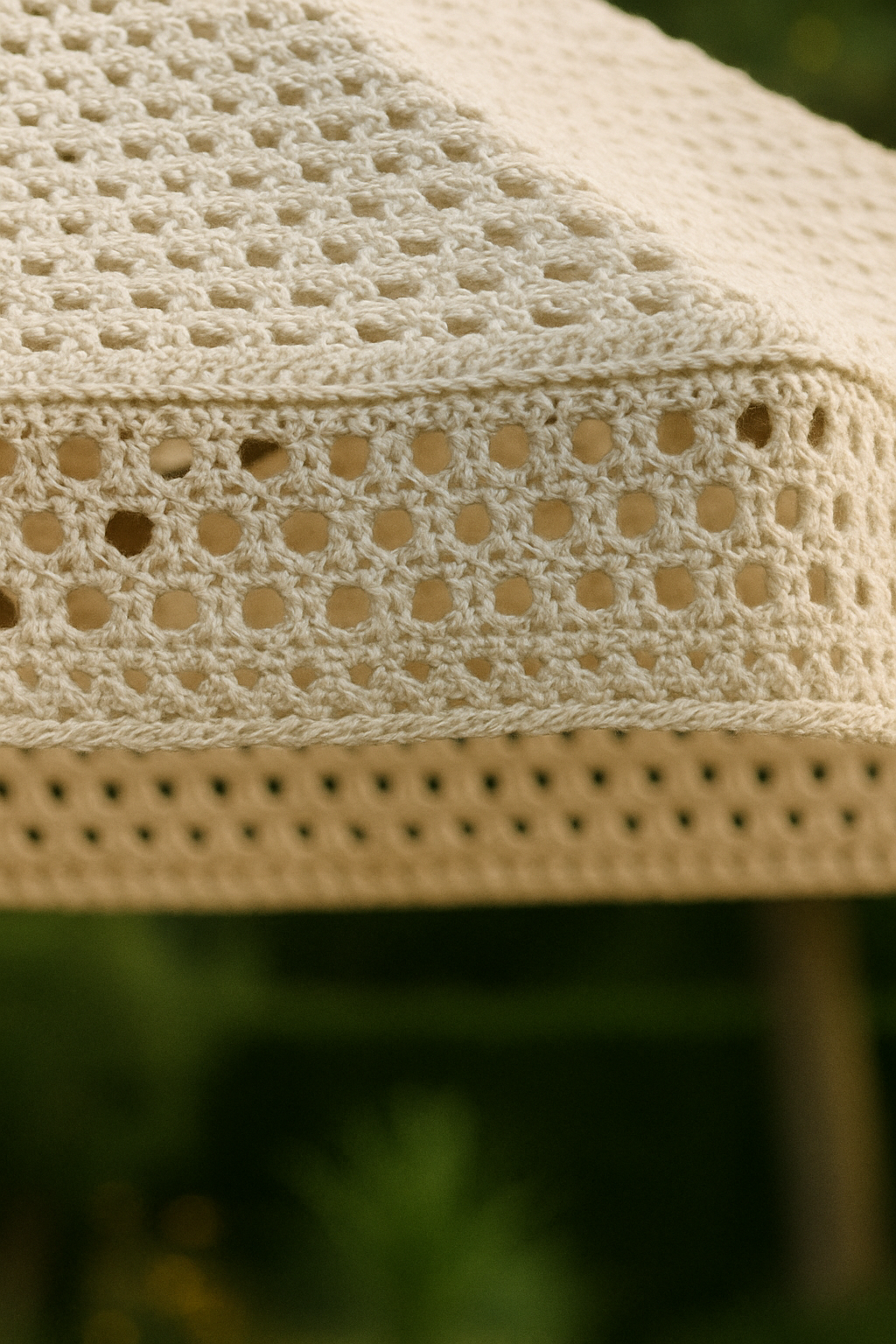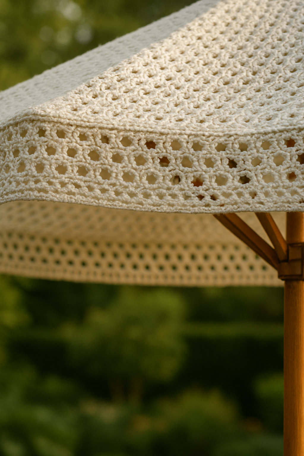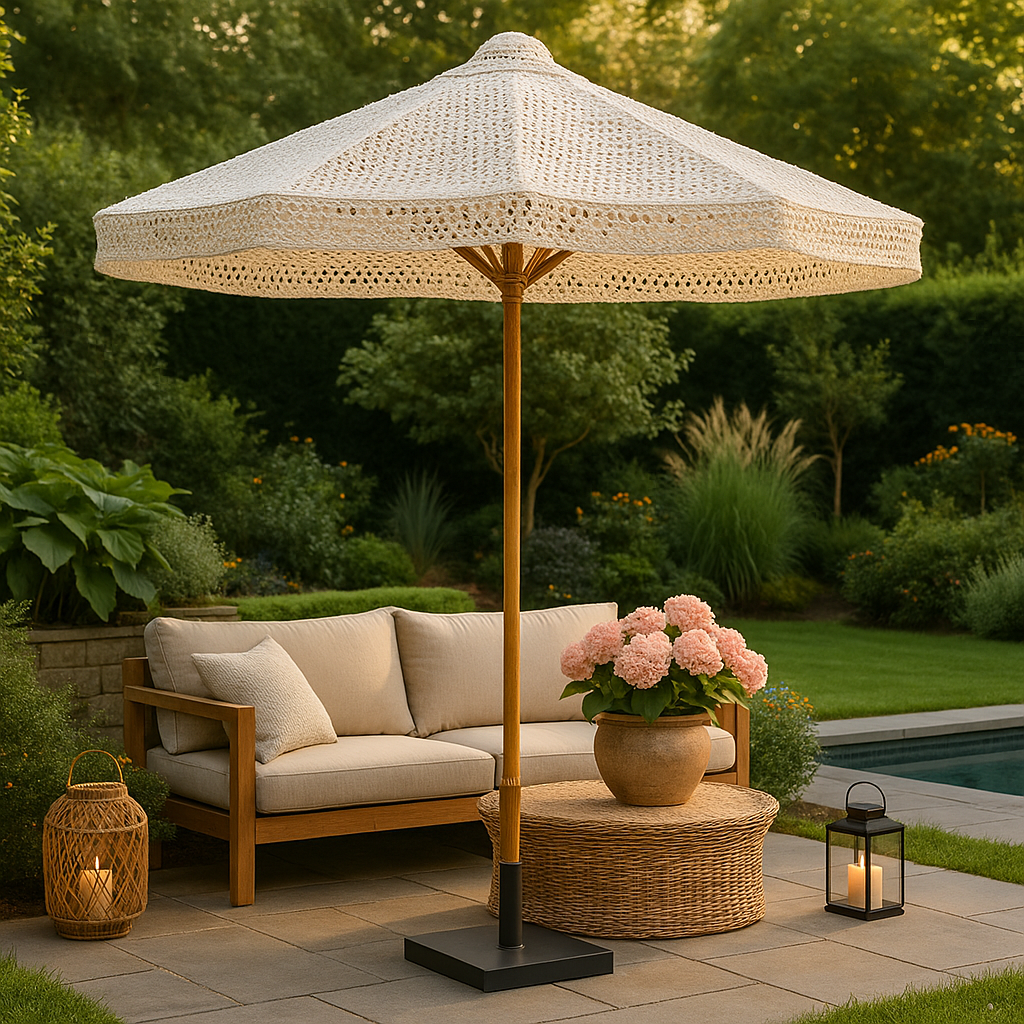 Un ombrellone decorativo e funzionale, pensato per creare ambientazioni rilassanti e raffinate all’aria aperta.