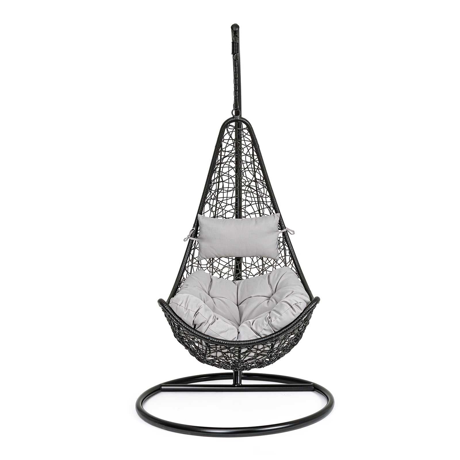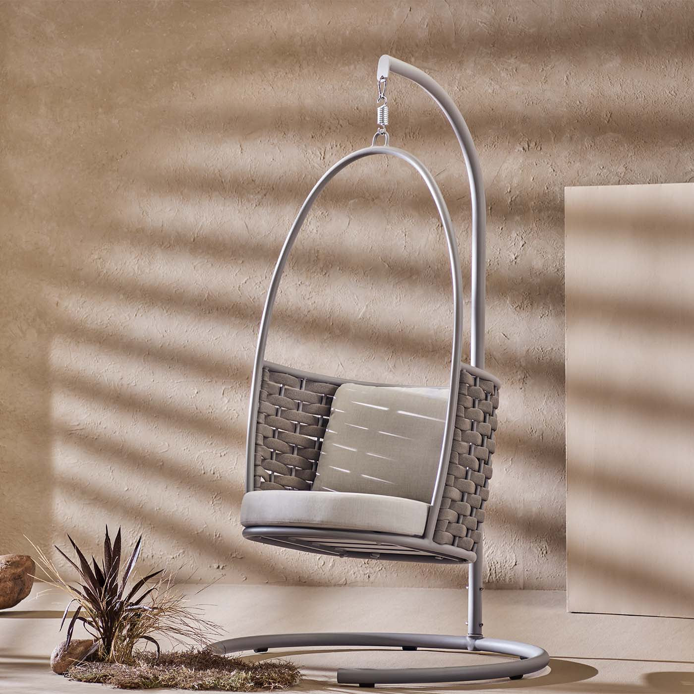 La poltrona sospesa "Marrakech" è il complemento d’arredo perfetto per chi desidera aggiungere un tocco di stile e comodità ai propri spazi esterni. Dal design moderno e avvolgente, unisce l’eleganza del rattan intrecciato alla funzionalità di una struttura solida in alluminio, per momenti di puro relax all’aperto.