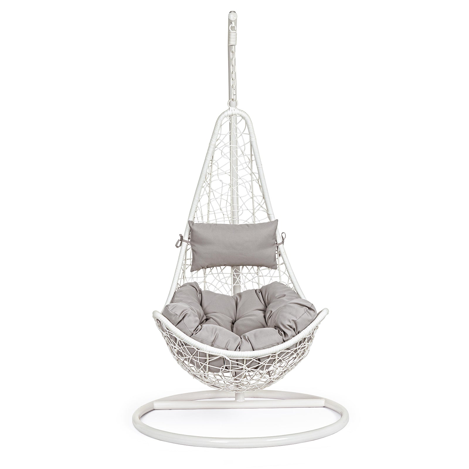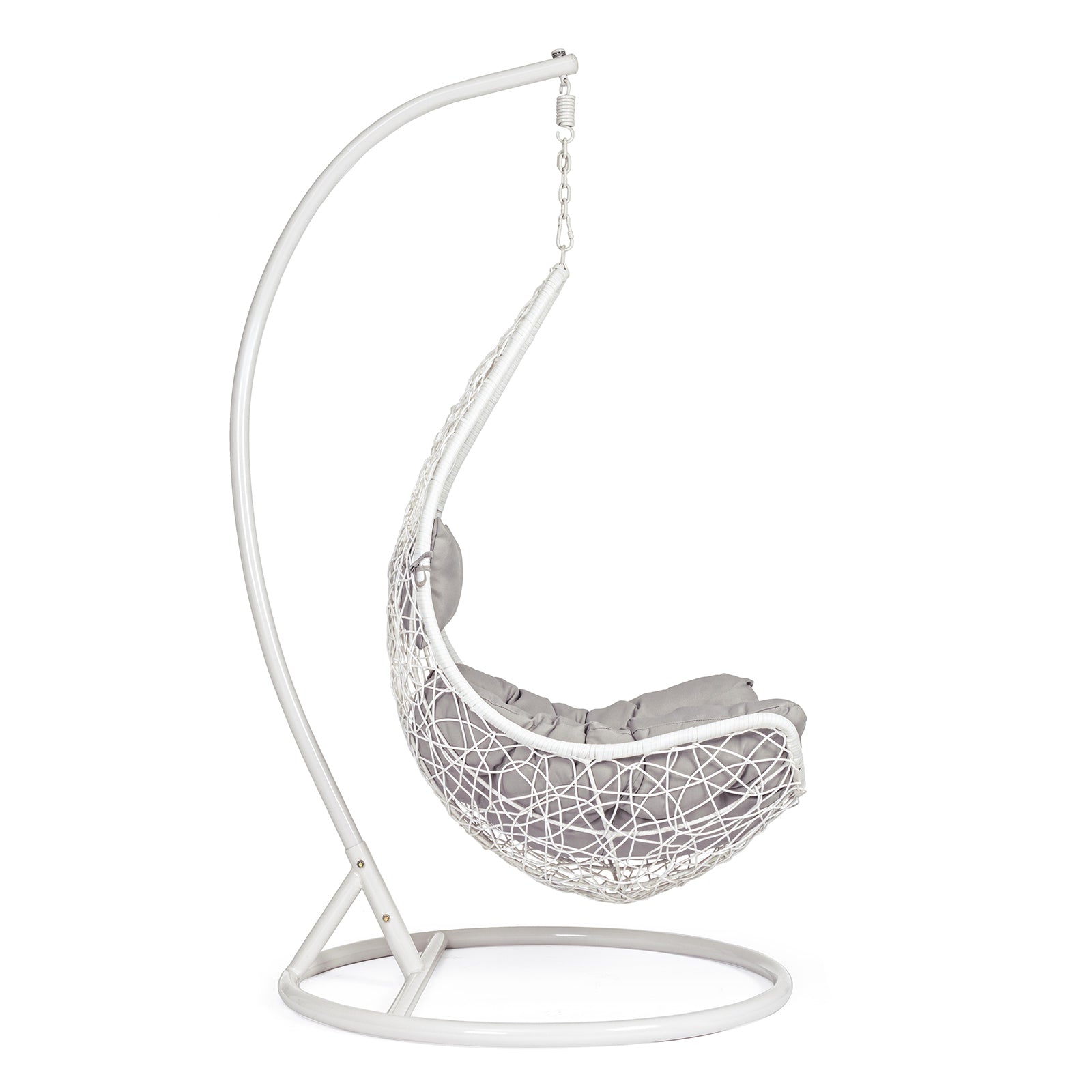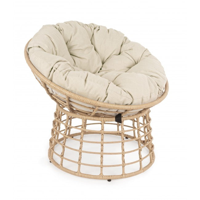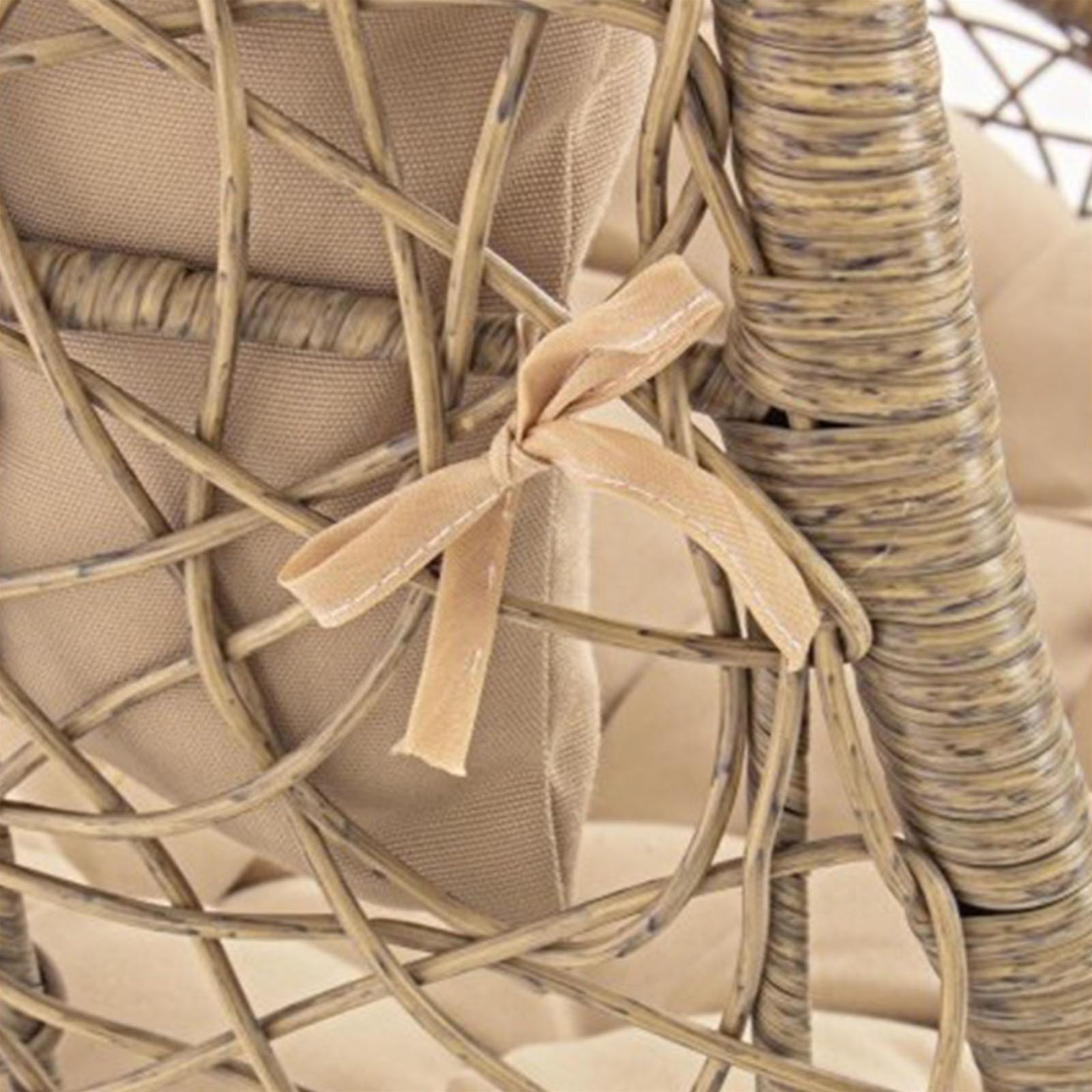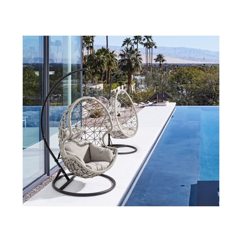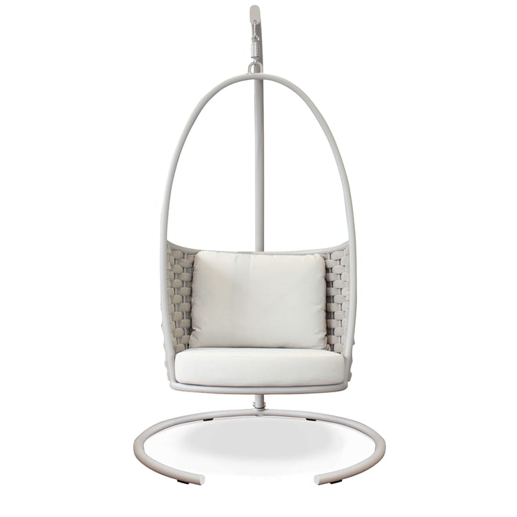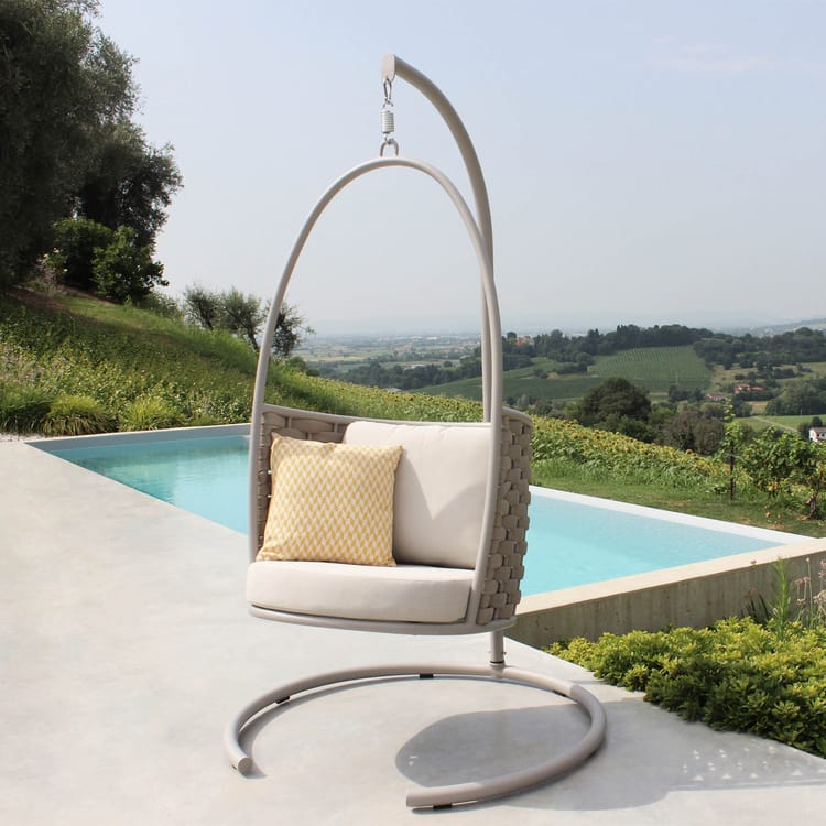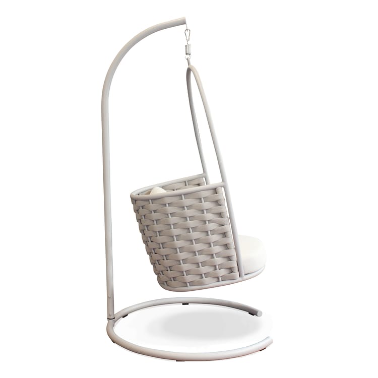 La seduta è completa di un cuscino imbottito con rivestimento TPU idrorepellente color beige, pensato per resistere alle condizioni atmosferiche e offrire il massimo del comfort. Il suo movimento a dondolo e il palo laterale conferiscono stabilità e libertà di oscillazione, rendendola ideale per terrazze, giardini e verande.