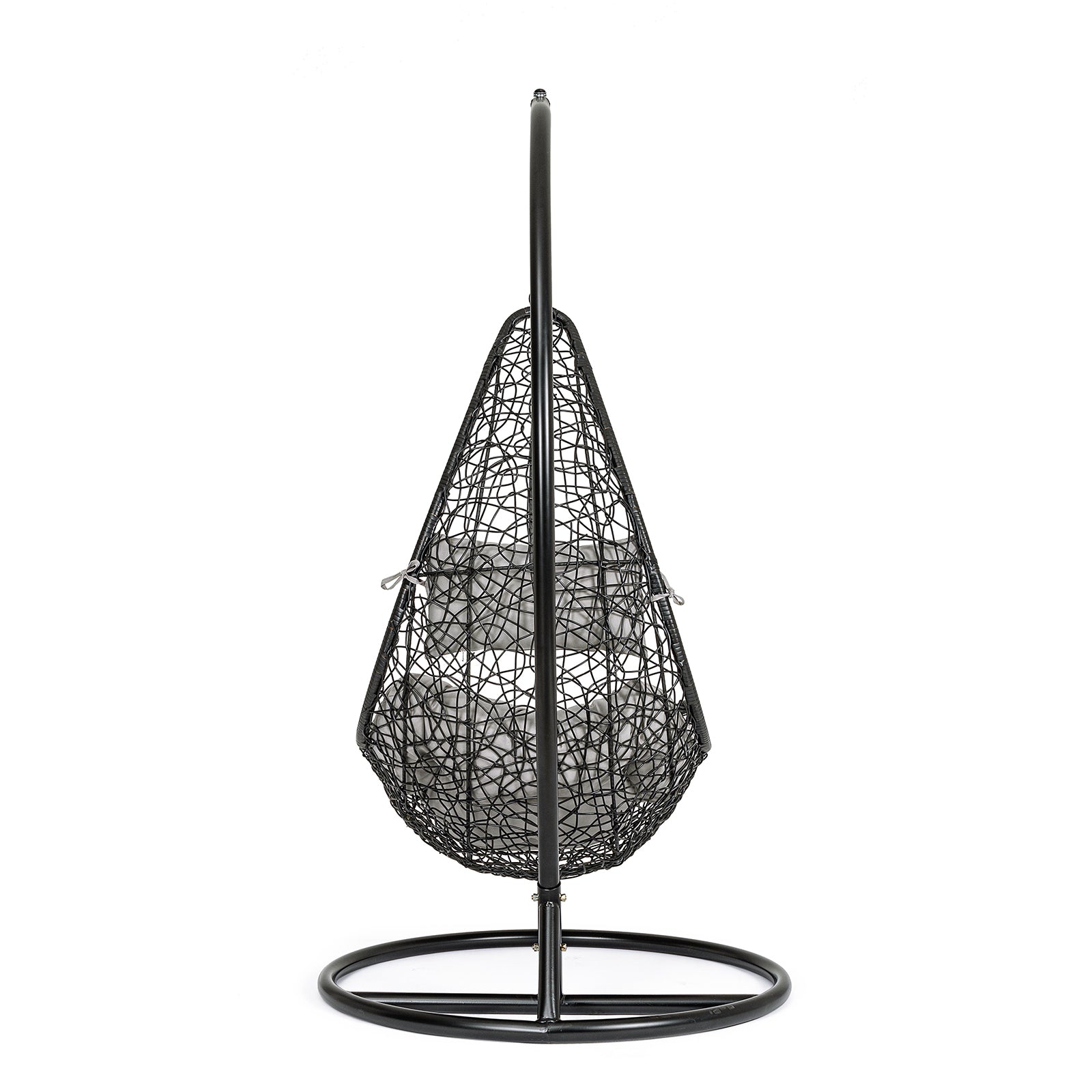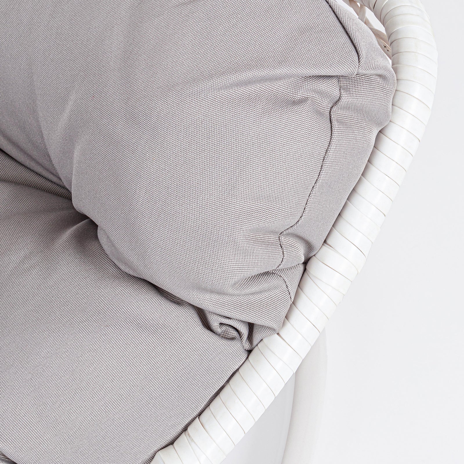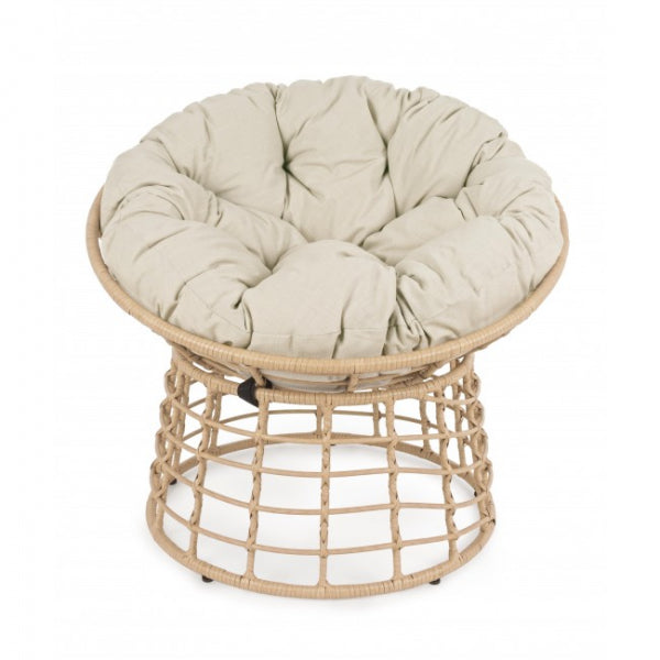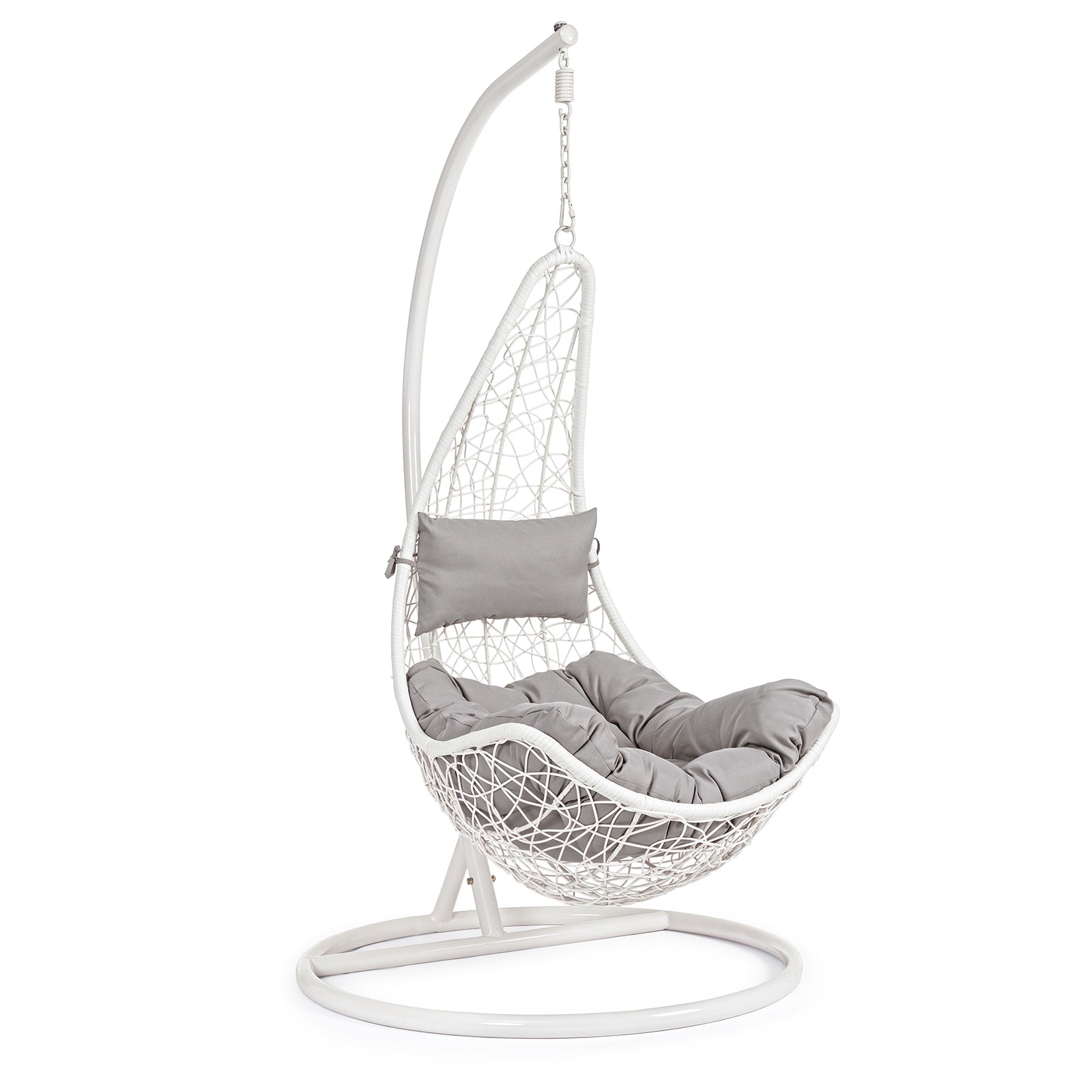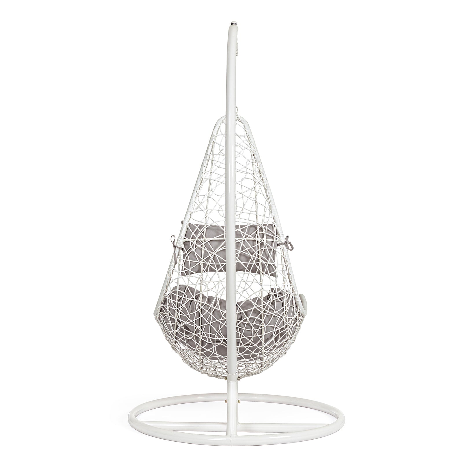 La seduta è completa di un cuscino imbottito con rivestimento TPU idrorepellente color beige, pensato per resistere alle condizioni atmosferiche e offrire il massimo del comfort. Il suo movimento a dondolo e il palo laterale conferiscono stabilità e libertà di oscillazione, rendendola ideale per terrazze, giardini e verande.