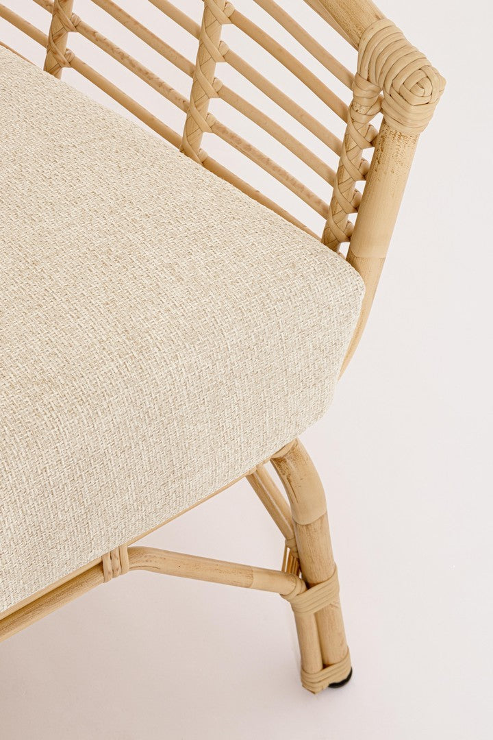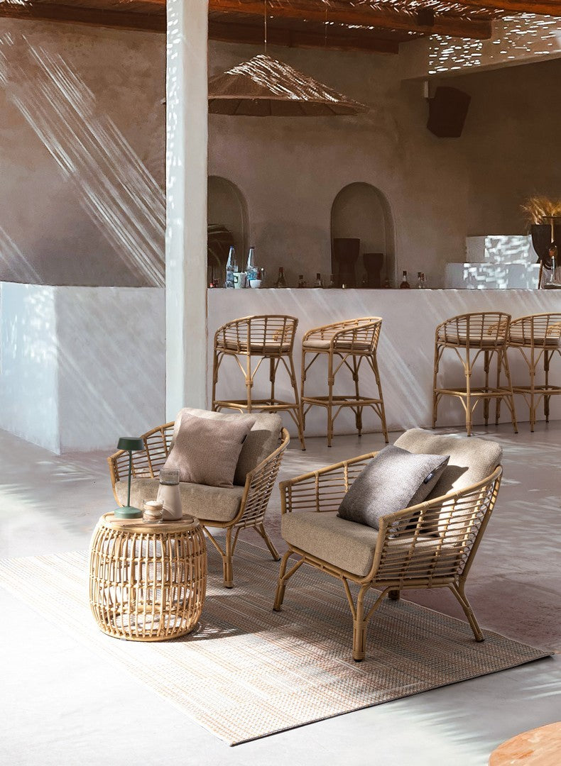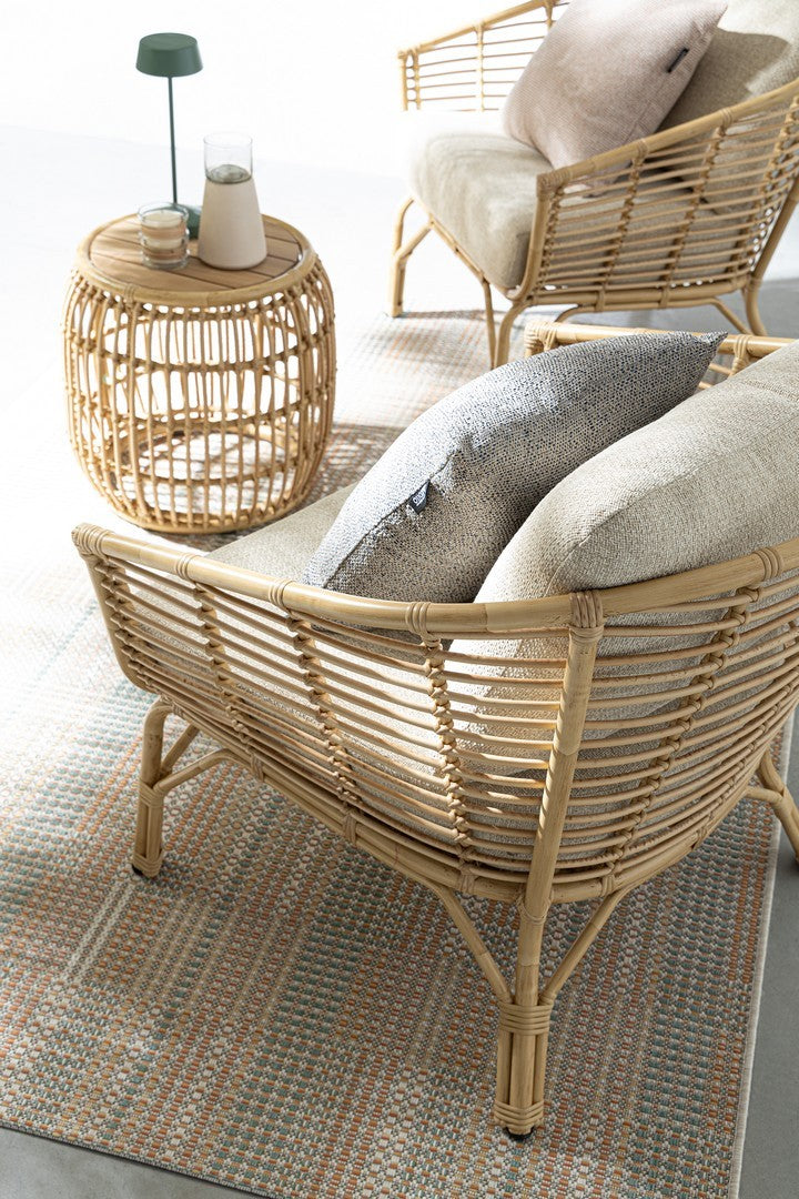 I braccioli e altre parti della poltrona presentano un effetto rattan, che aggiunge un tocco estetico naturale e sofisticato, combinando l'aspetto tradizionale del rattan con i vantaggi della durabilità dell'alluminio.