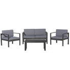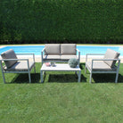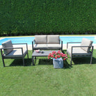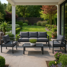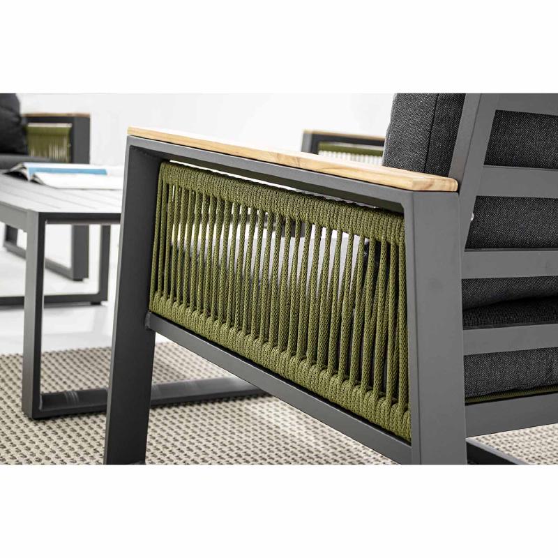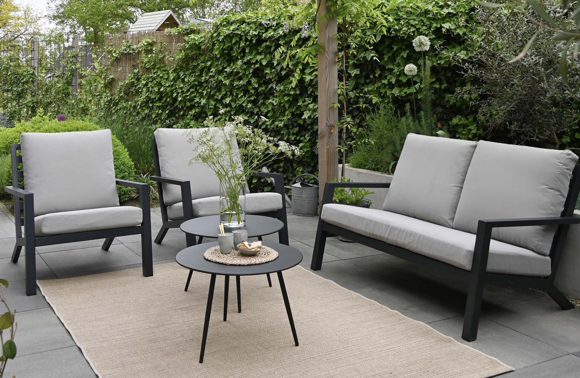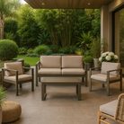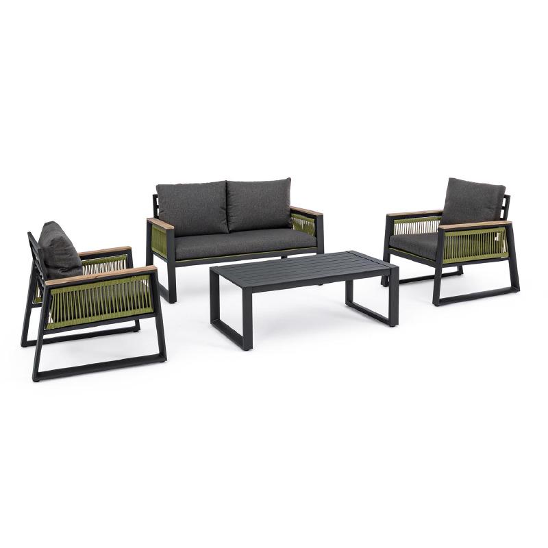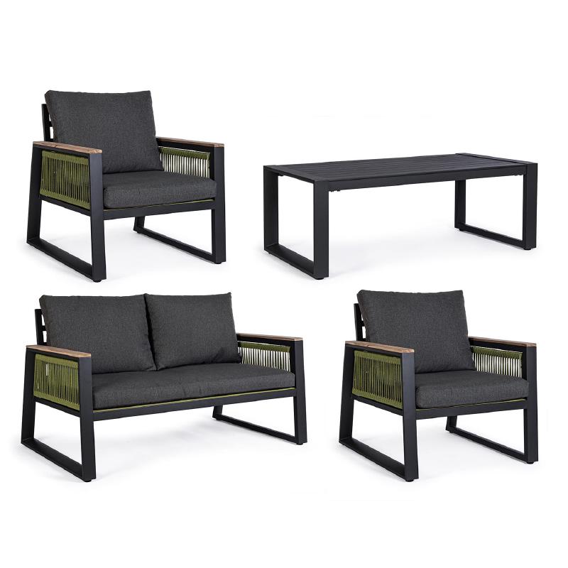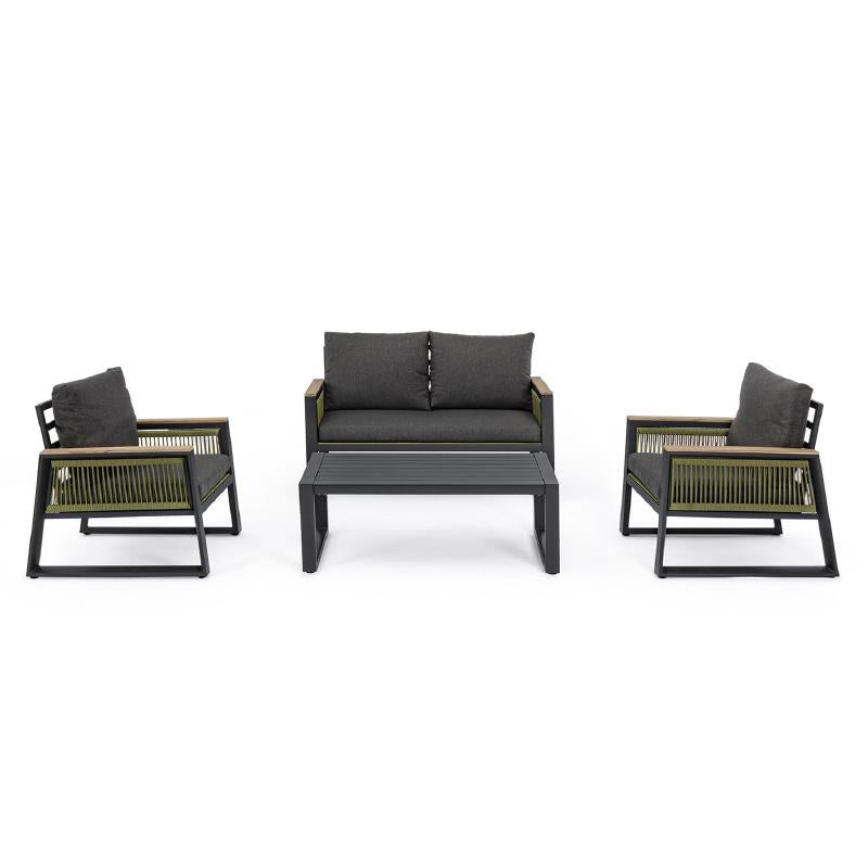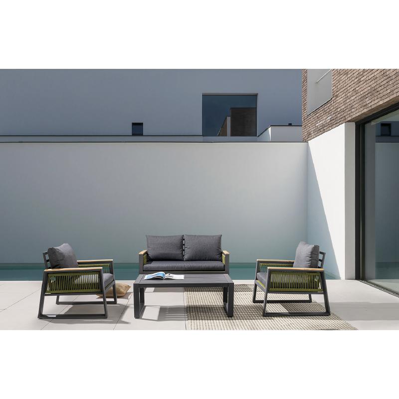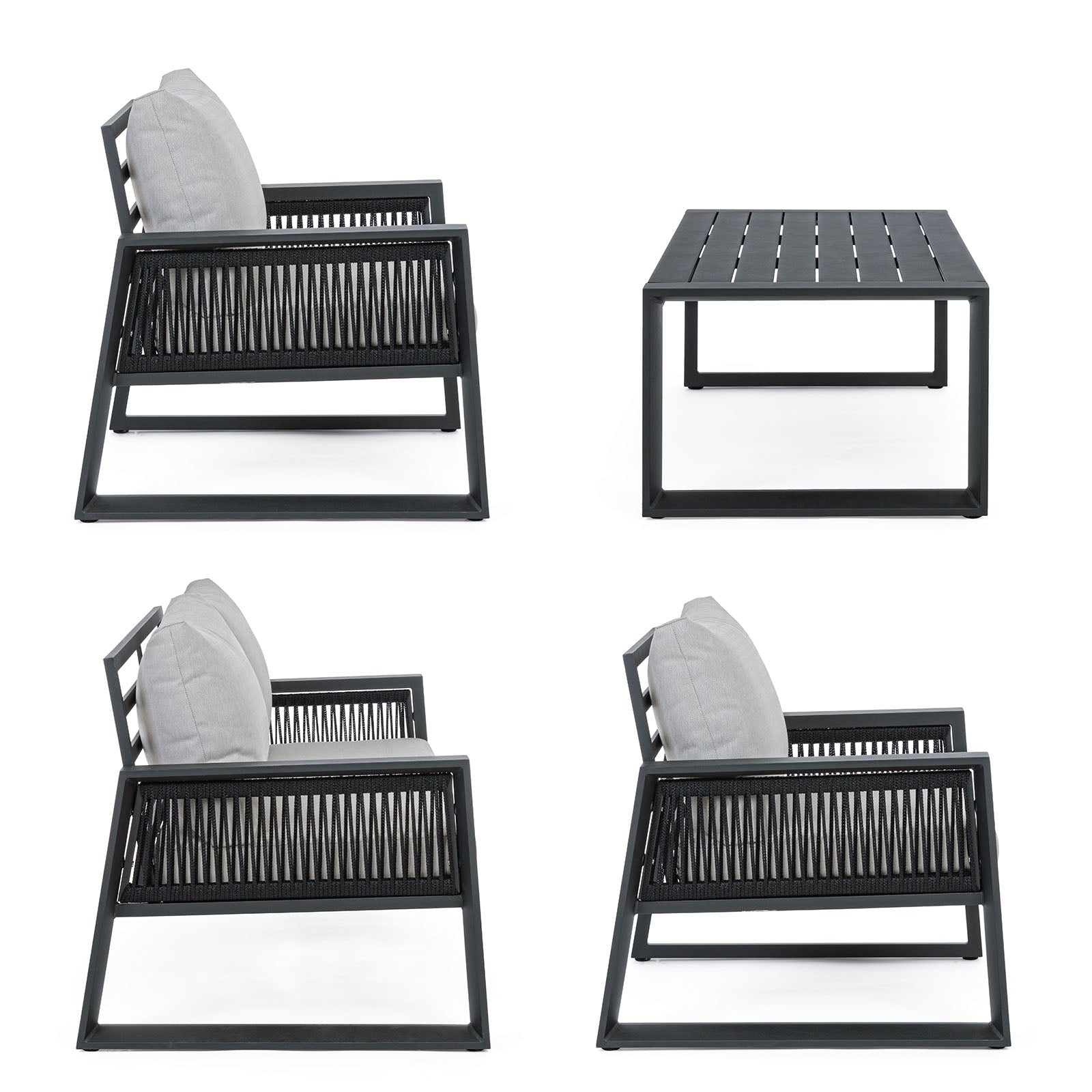 Il salotto da giardino è costituito da due grandi poltrone, un tavolino e un divano a due posti.