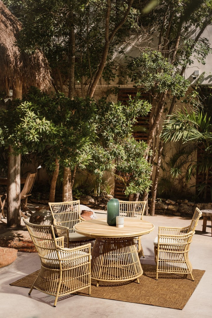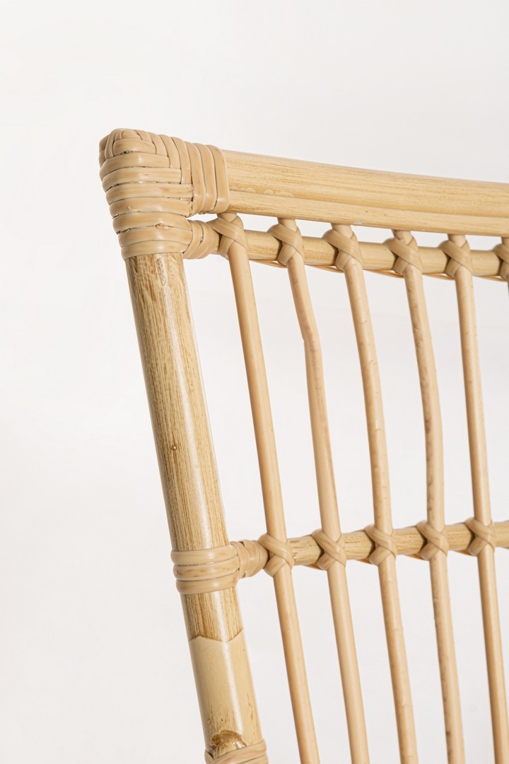 La superficie della sedia è caratterizzata da un effetto rattan, un dettaglio che riproduce l'aspetto naturale dell'intreccio di rattan, ma con i vantaggi della durata e della bassa manutenzione tipici dell'alluminio.