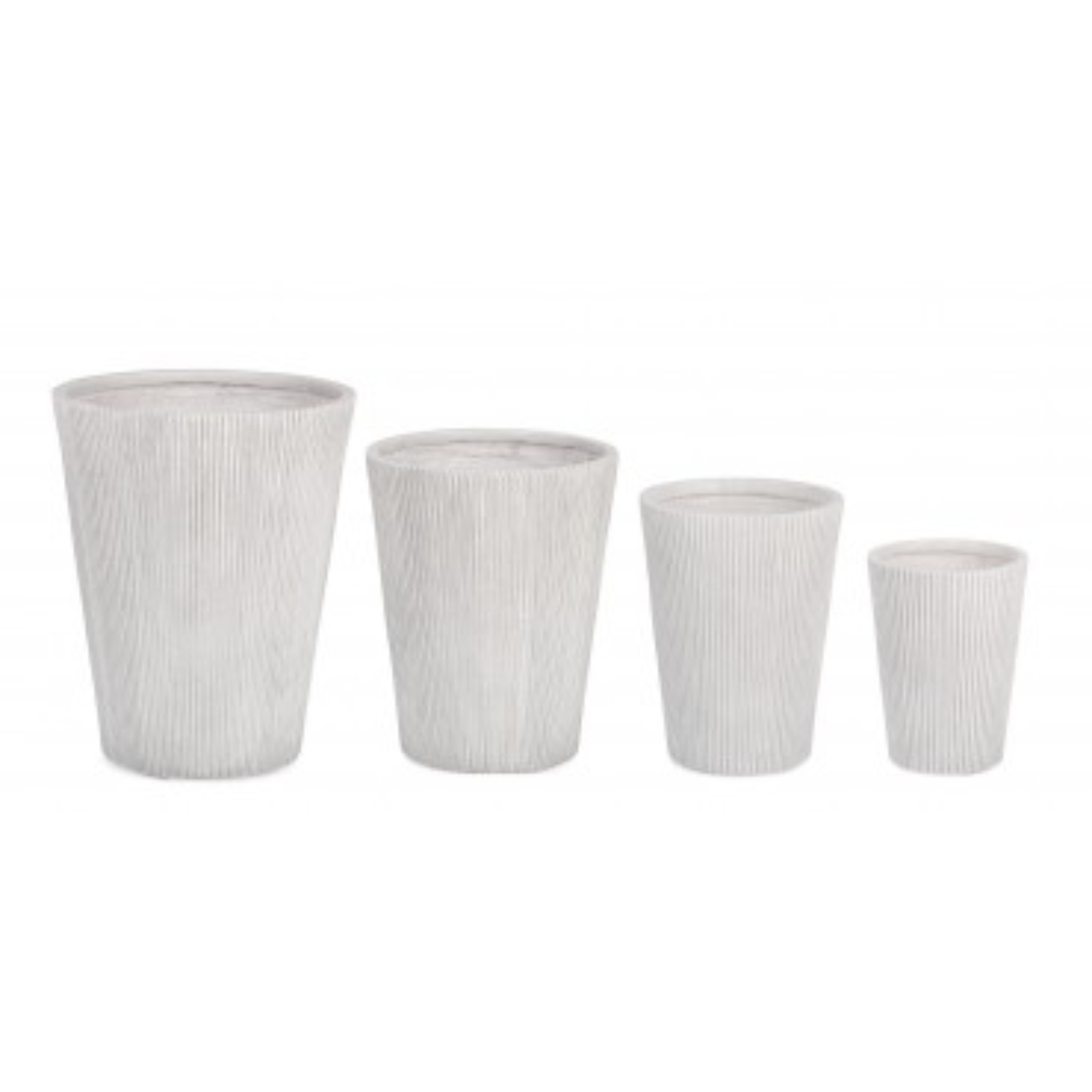 Questo set include quattro porta vasi dalla forma svasata e dal design a coste, progettati per aggiungere un tocco di stile e modernità a giardini, terrazze o balconi.
