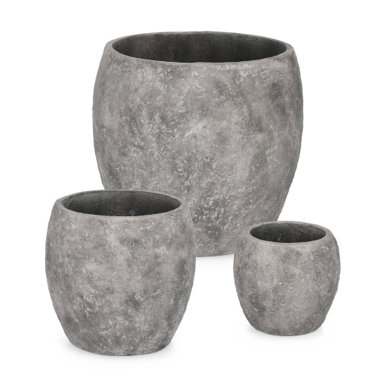La forma bombata dei vasi aggiunge un tocco morbido e accogliente, mentre la terracotta grigia, resistente e durevole, garantisce robustezza contro le intemperie.