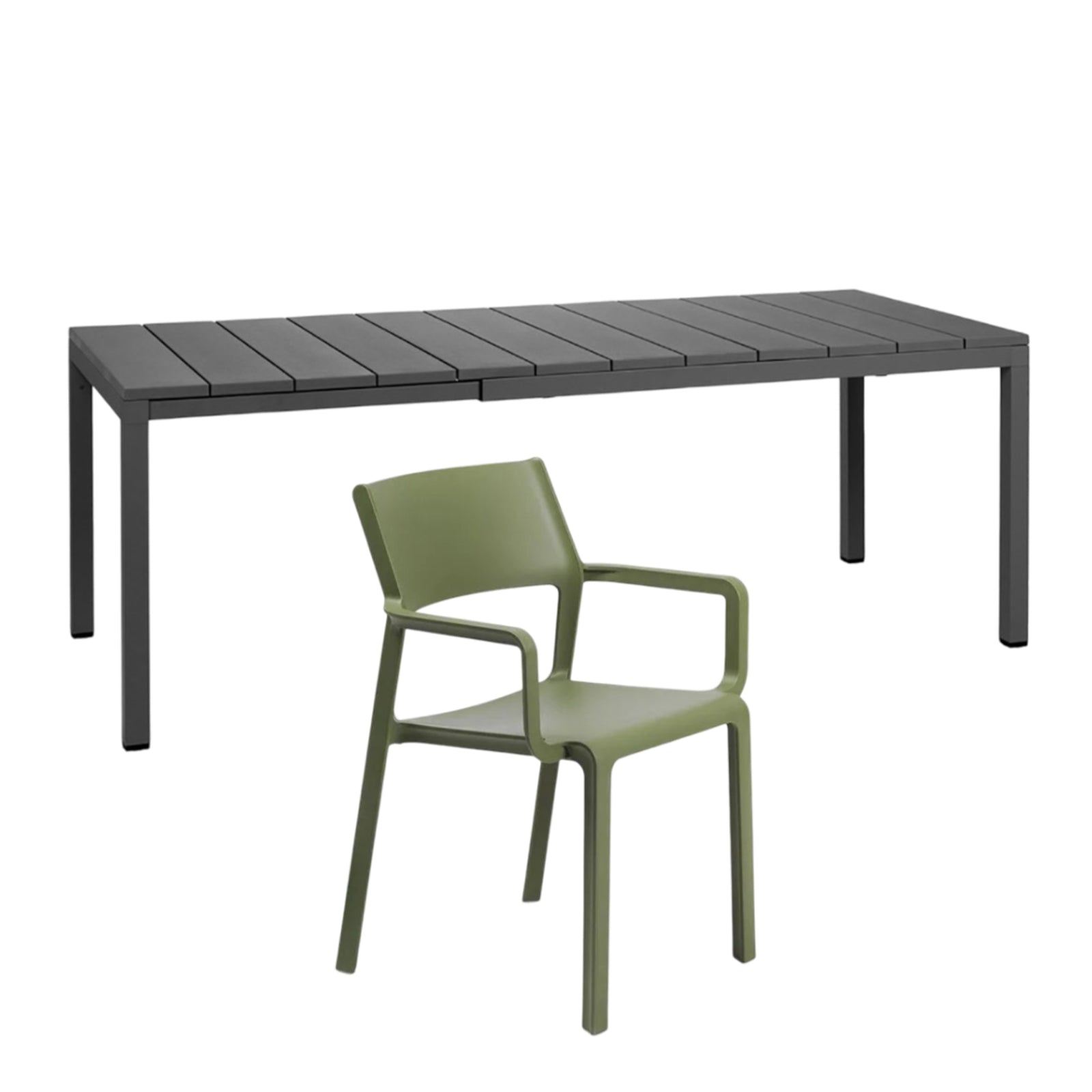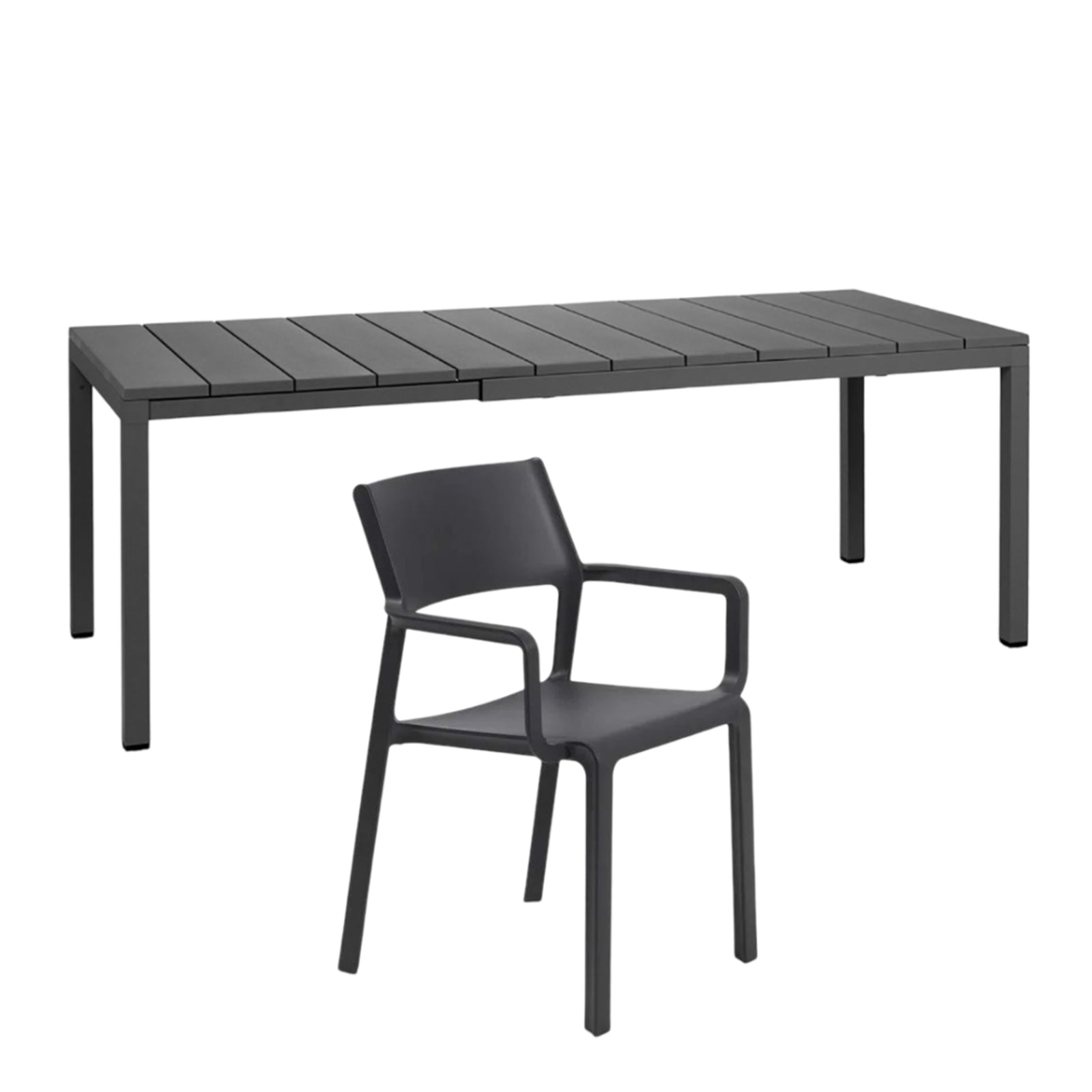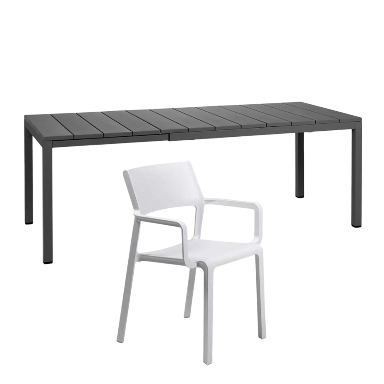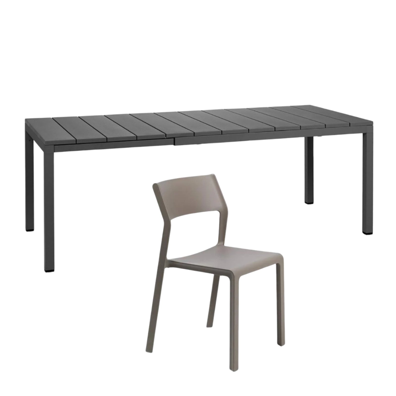 Scopri il set tavolo Rio Allungabile 140-210 cm con 4 sedie Trill, la soluzione versatile e pratica per arredare sia interni che esterni. Perfetto per creare un ambiente accogliente e moderno in patio, giardino, sala da pranzo o terrazzo, questo set unisce funzionalità, comfort e design contemporaneo.