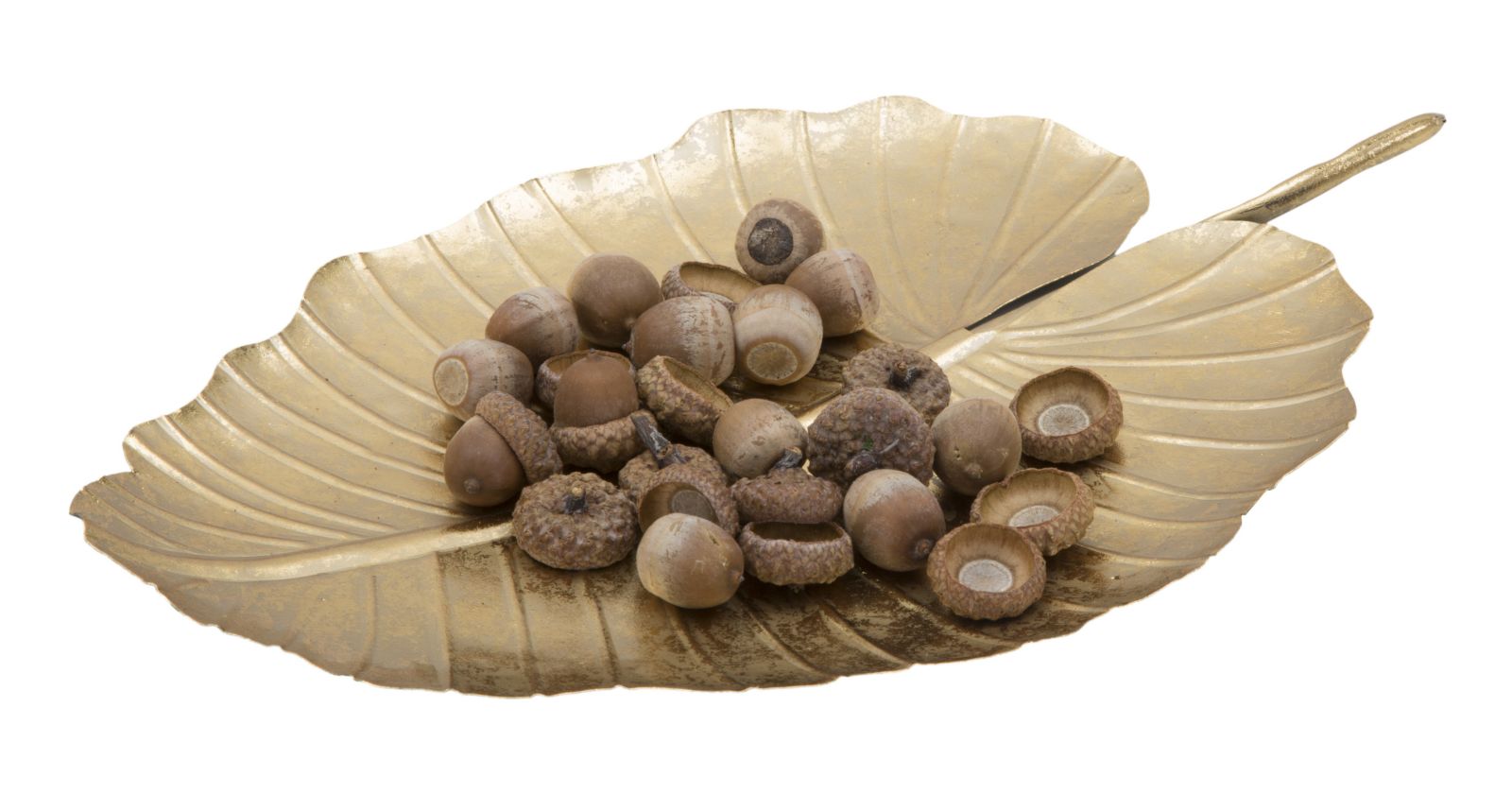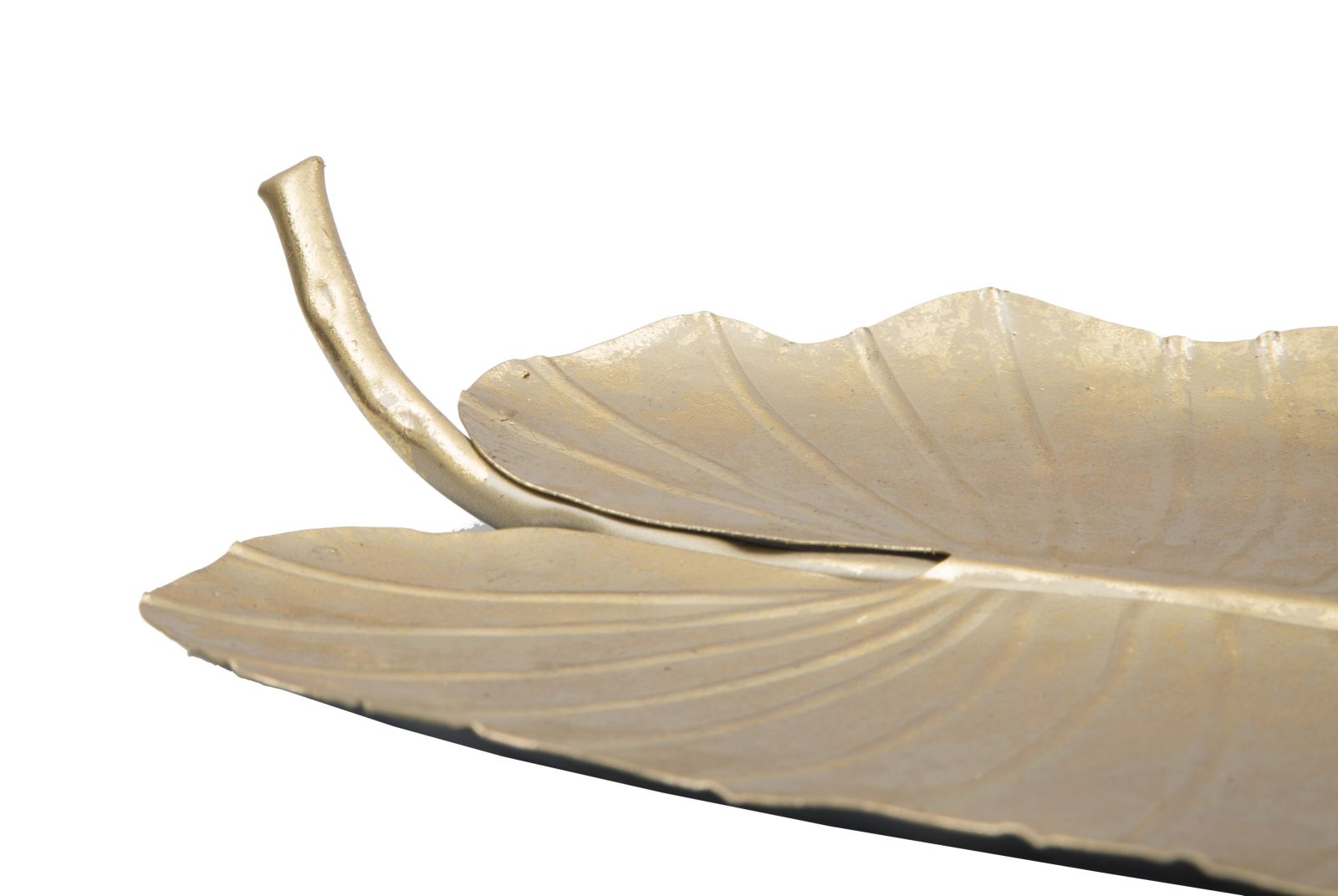 Realizzato in metallo con finitura dorata, questo oggetto cattura l'attenzione per il suo splendore e per il dettaglio artistico con cui è stata riprodotta la forma di una foglia, rendendolo un pezzo di decoro sofisticato e di classe.
