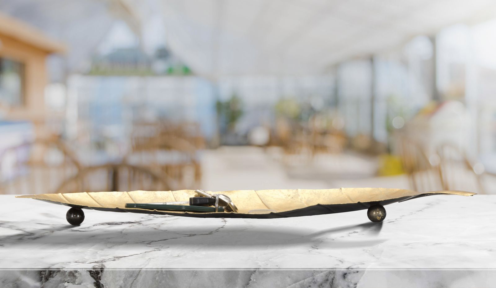 Lo svuota tasche "foglia long" in metallo colore oro per interni è un elegante accessorio d'arredo che combina estetica raffinata e funzionalità.