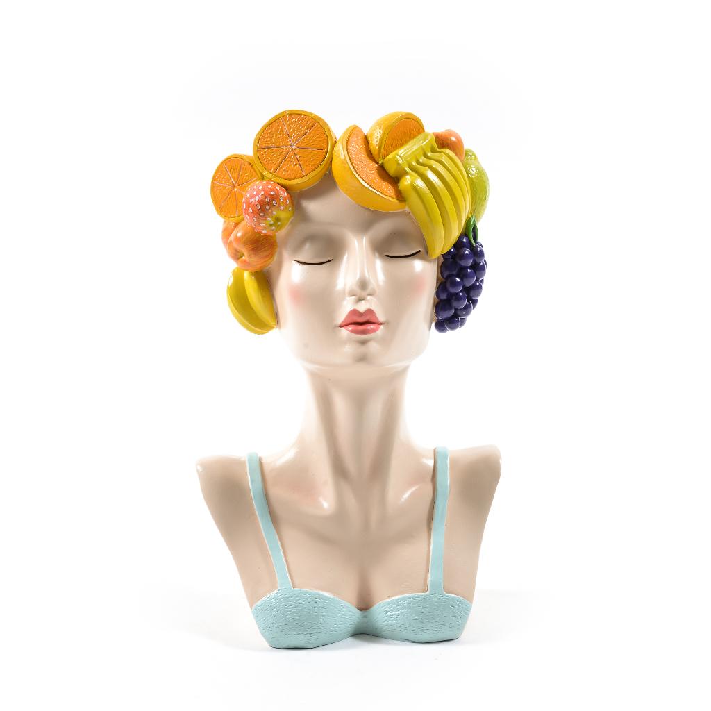 Vaso "Donna con cappello di frutta" in resina, decorazione per uso interno ed esterno